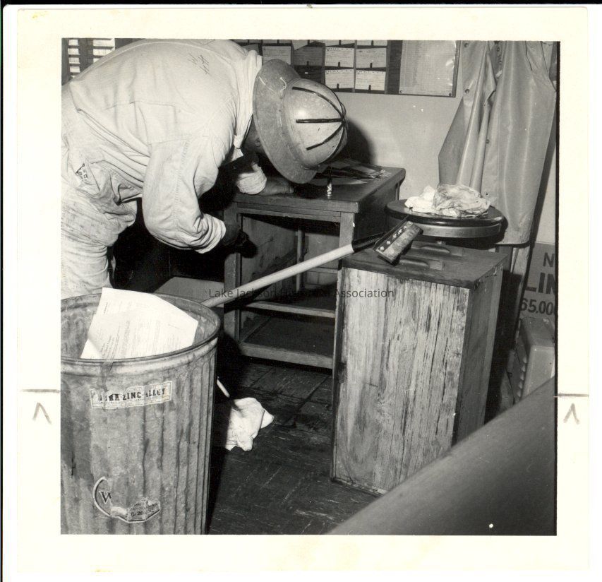 A small black and white picture of a worker looking in a cabinet after Hurricane Carla. The back of the picture reads "O. White looking for snakes Bldg. 705".Collection