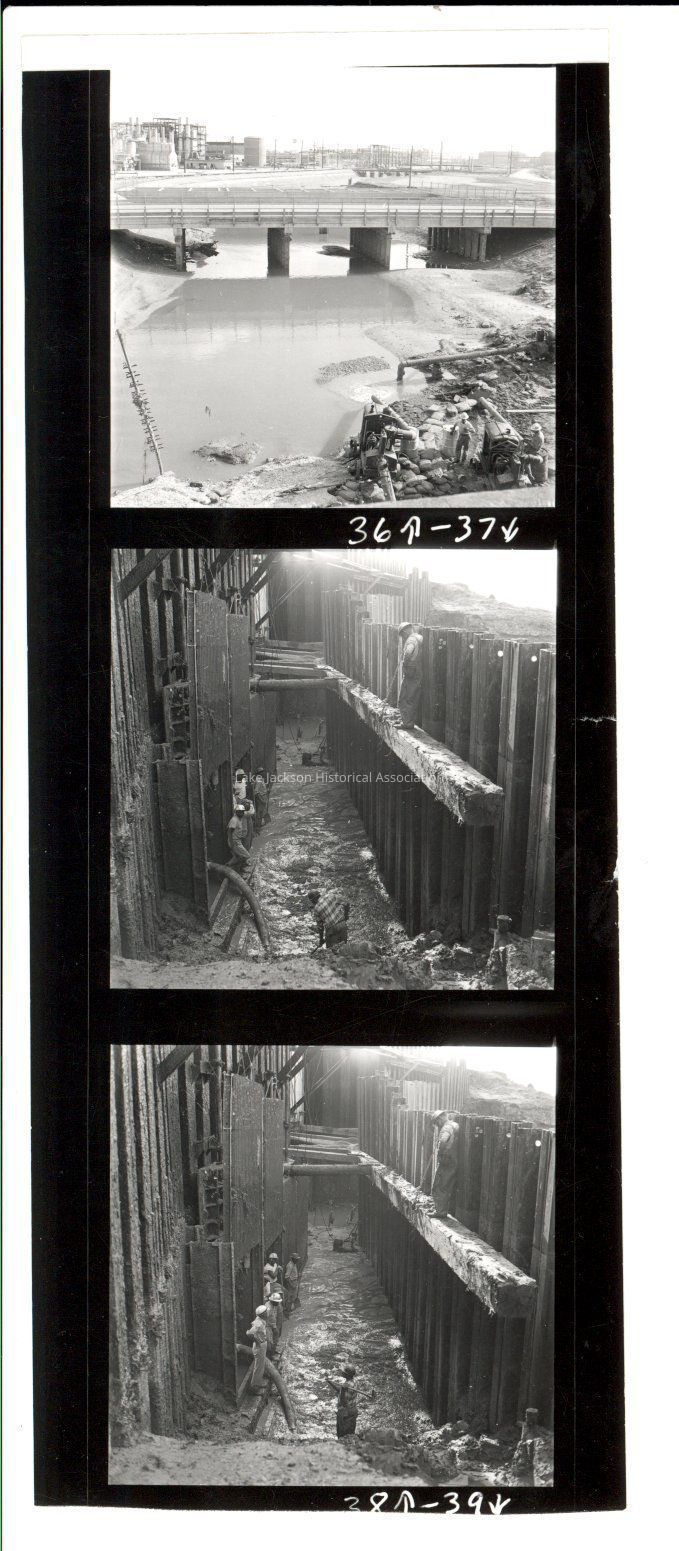 A strip of 3 black and white proofs of pictures of water flooding part of the plant after Hurricane Carla.Collection