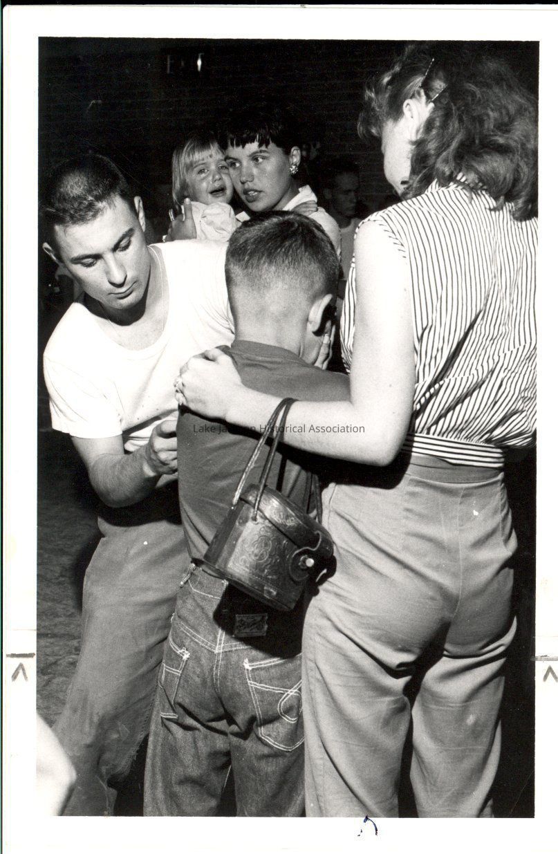 A black and white picture of a child receiving a shot after Hurricane Carla.Collection