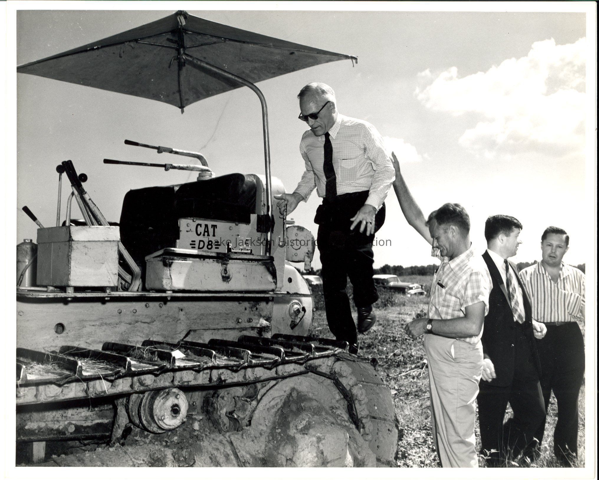 A black & white photo of Dr. Beutel getting on a bulldozer at the ground breaking of the Plaquemine Plant in Louisiana. Four men on ground next to bulldozer.Collection