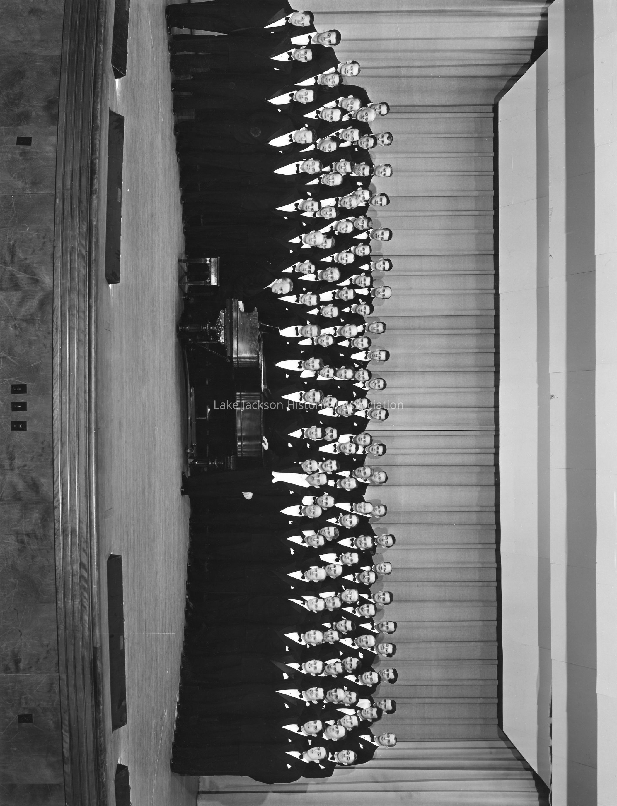 A black & white photo of the Dow Male Chorus. Back of picture reads: "Members of the Dow Male Chorus of The Dow Chemical Company, Midland, Michigan, who will sing a series of 7 concerts in Tulsa, Oklahoma, and at Freeport and Houston, Texas, March 11 - 14. Dr. Theodore Vosburg, conductor of the Chorus, right".Collection