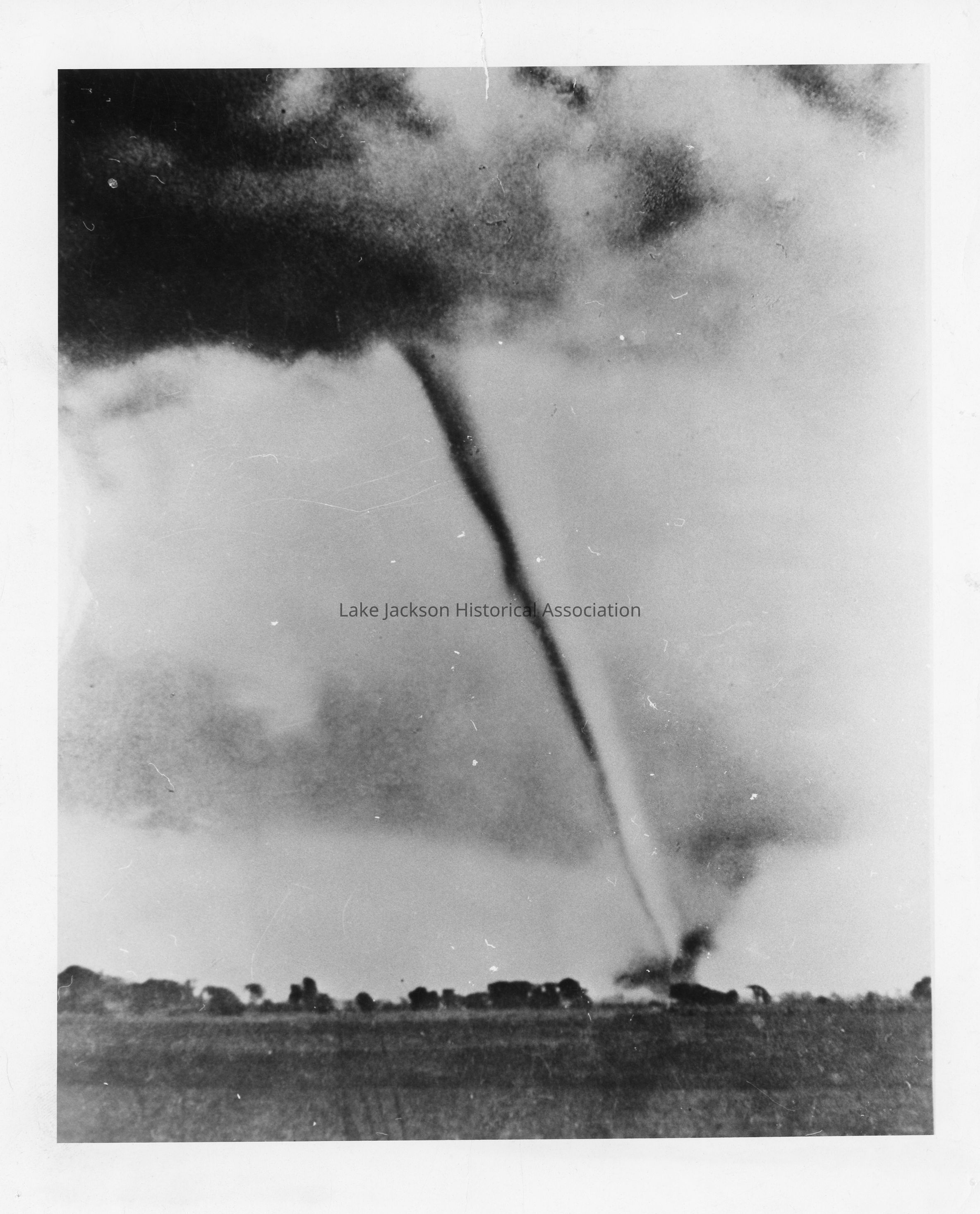Black and white photo of a Tornado spawned from 1943 hurricane. Also has the name E. Pyle and the back of photo.Collection