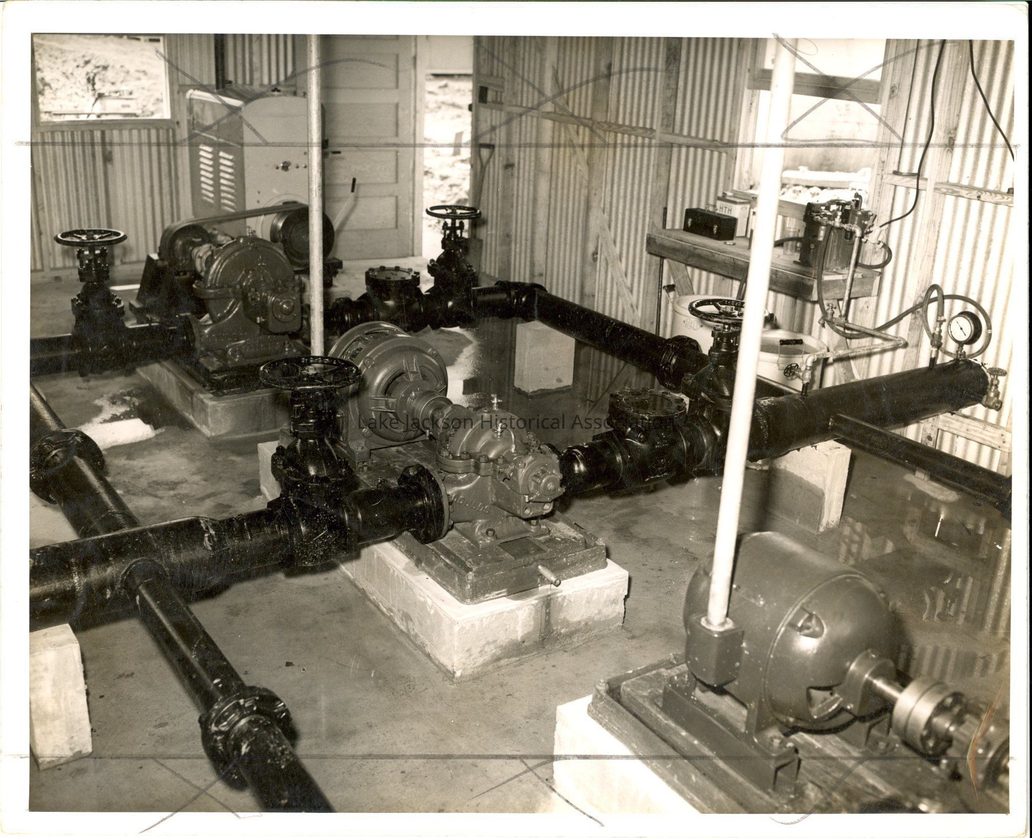 A Black & White Photo of Camp Chemical water supply room and equipment.Collection
