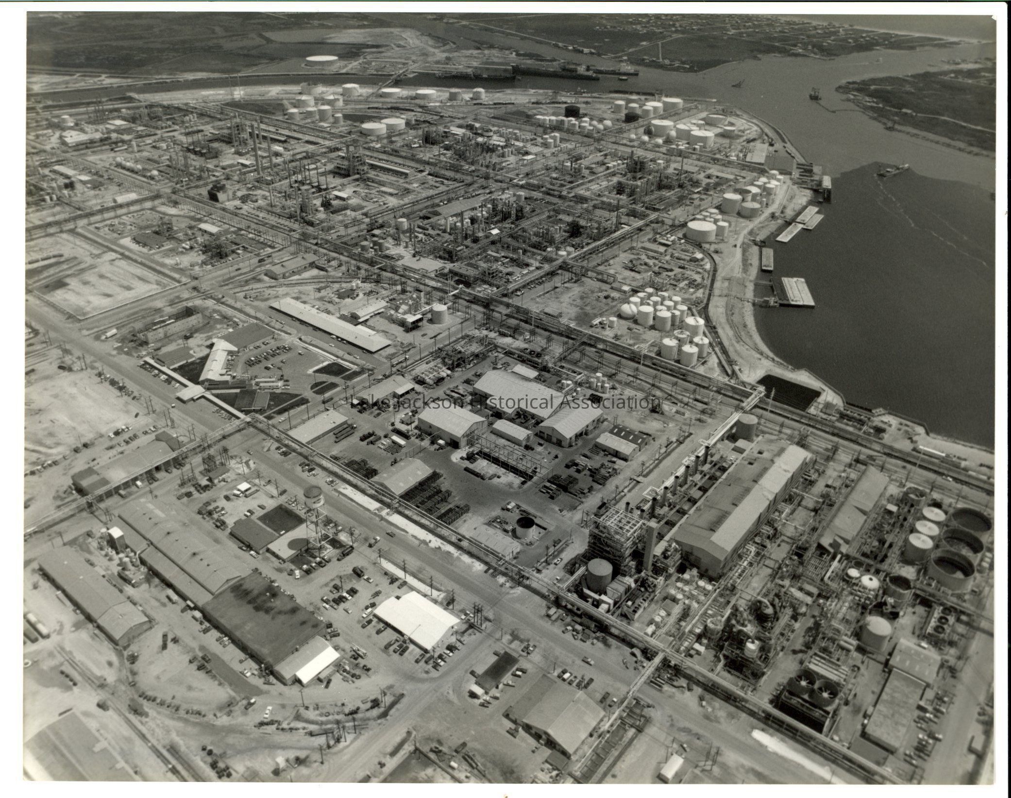 A Black & White Aerial Photo of Plant A, looking out toward the Gulf of Mexico with Brazos River on right emptying into Gulf.Collection