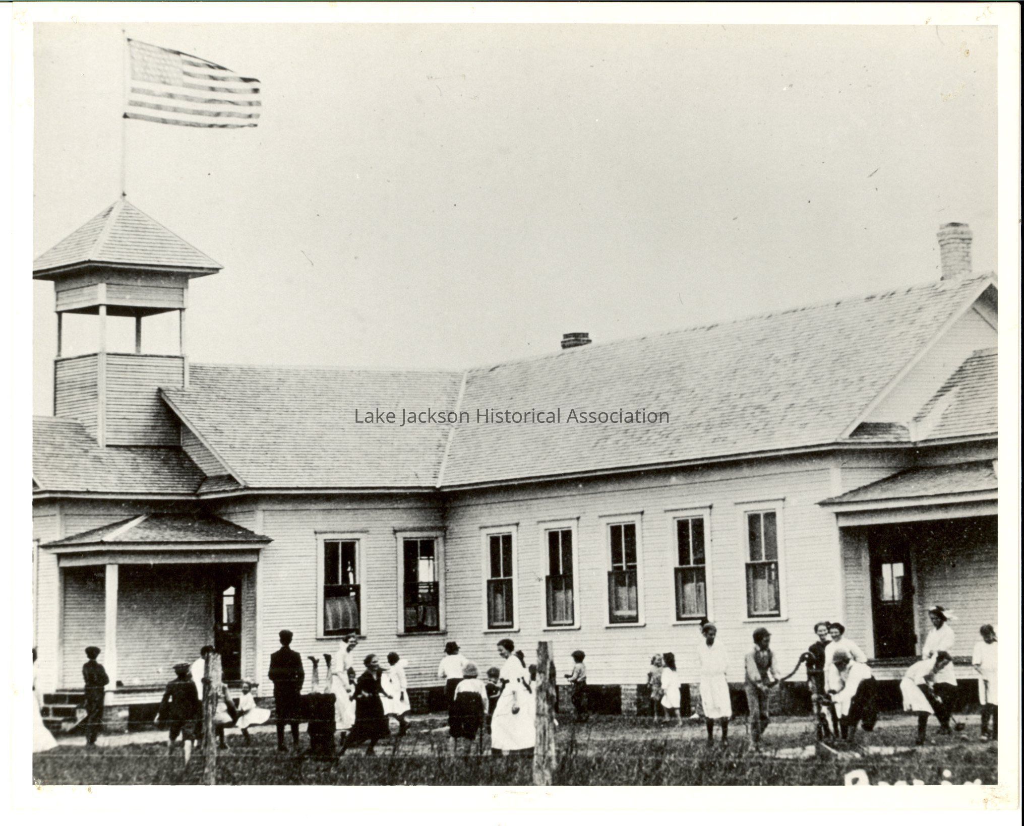 A Black & White Photo of boys and girls playing in front of a public school house in Danbury, Texas.Collection