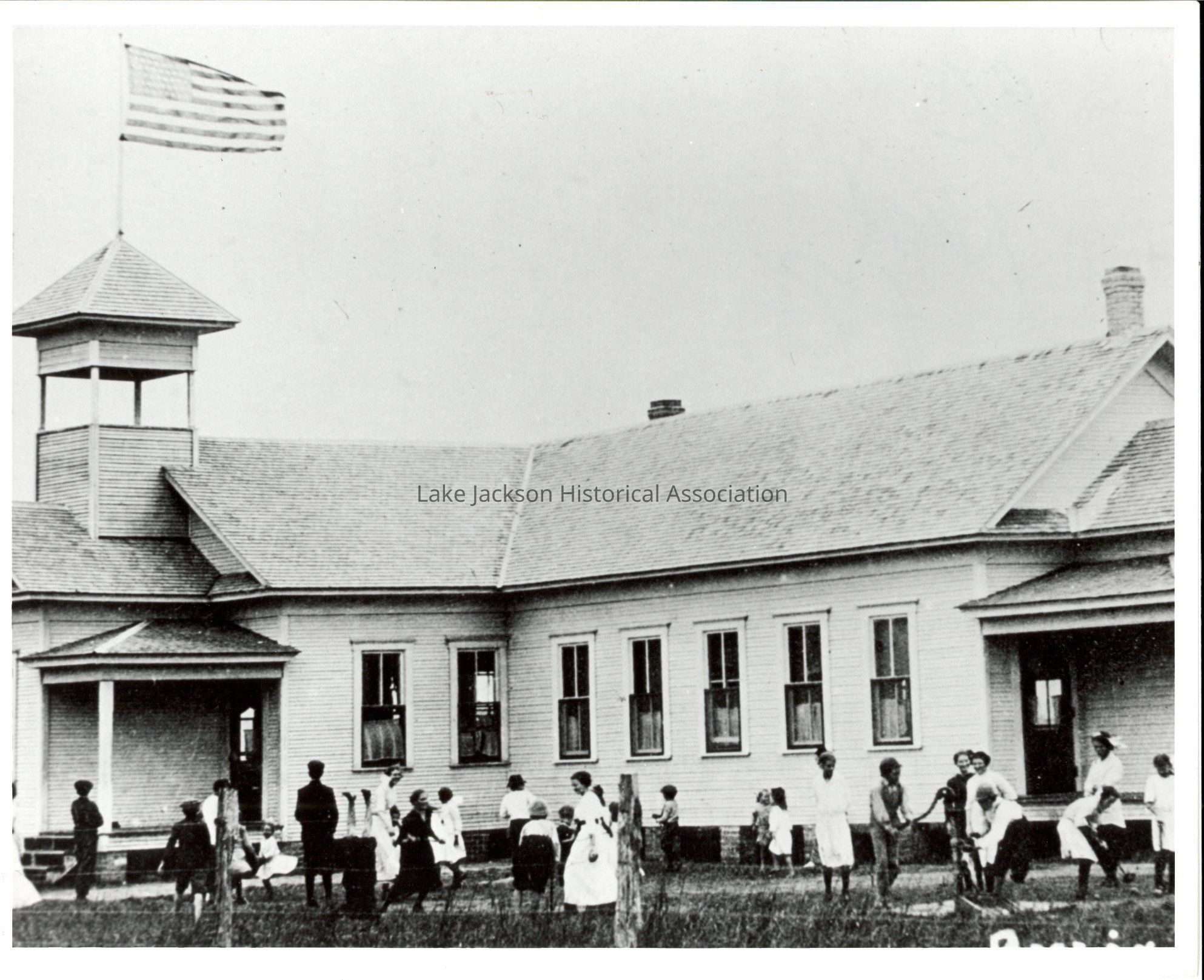 A Black & White Photo of boys and girls playing in front of a public school house in Danbury, Texas.Collection