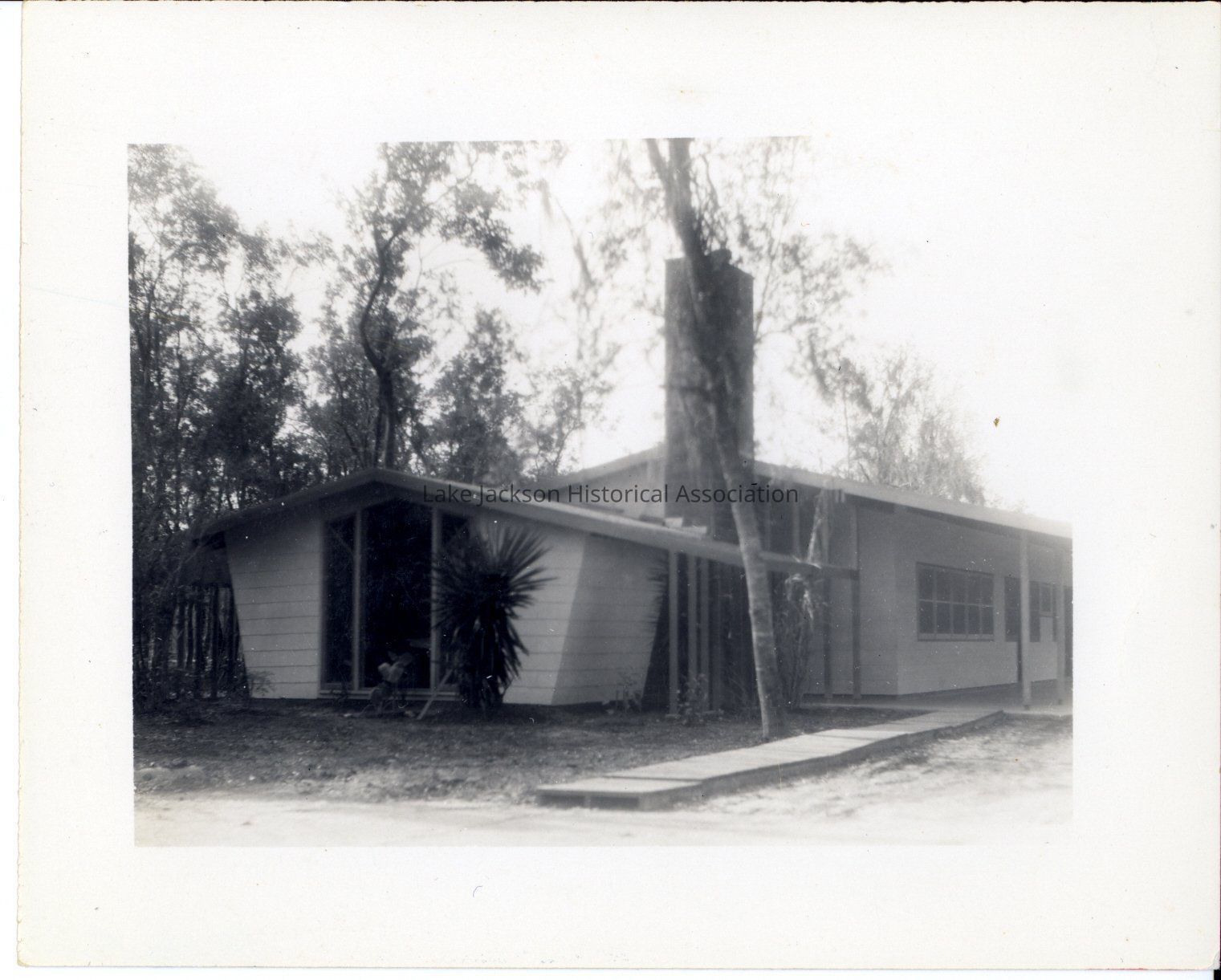 Black and white photo of exterior view of Alden Dow's office.Collection