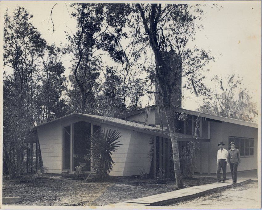 Black and white photo of exterior view of Alden Dow's office showing two men walking past.Collection