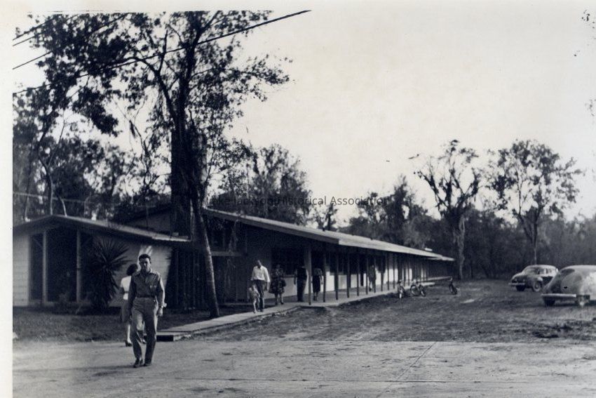 Black and white photo of exterior view of Alden Dow's office and Carriage square showing several people walking on the porch and before paving of the parking area.Collection