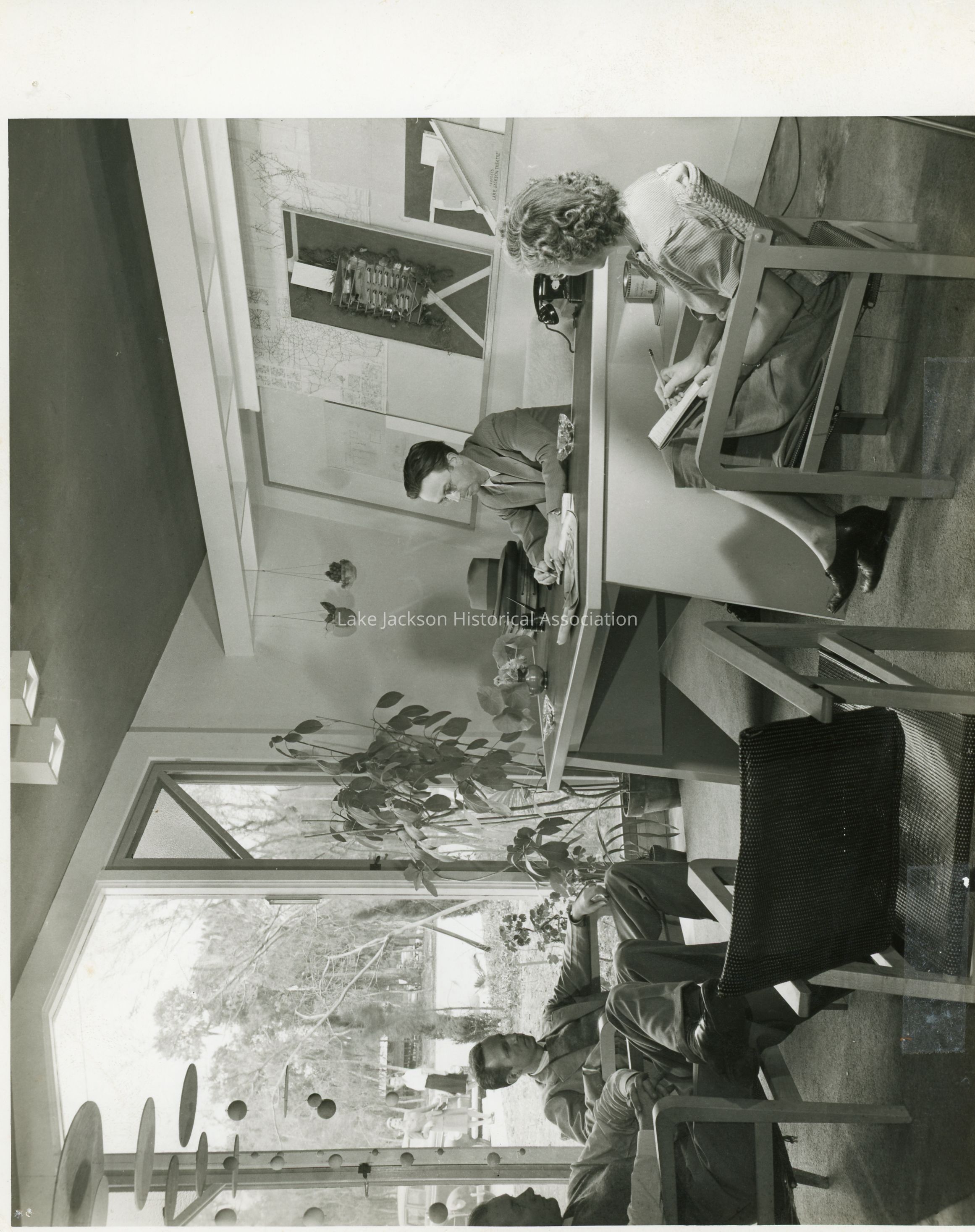 Black and white photo of the interior of Alden Dow's office showing Alden Dow at his desk with his secretary Clyde Passmore, T.J. Dunbar, and Frank Steves in attendence.Collection
