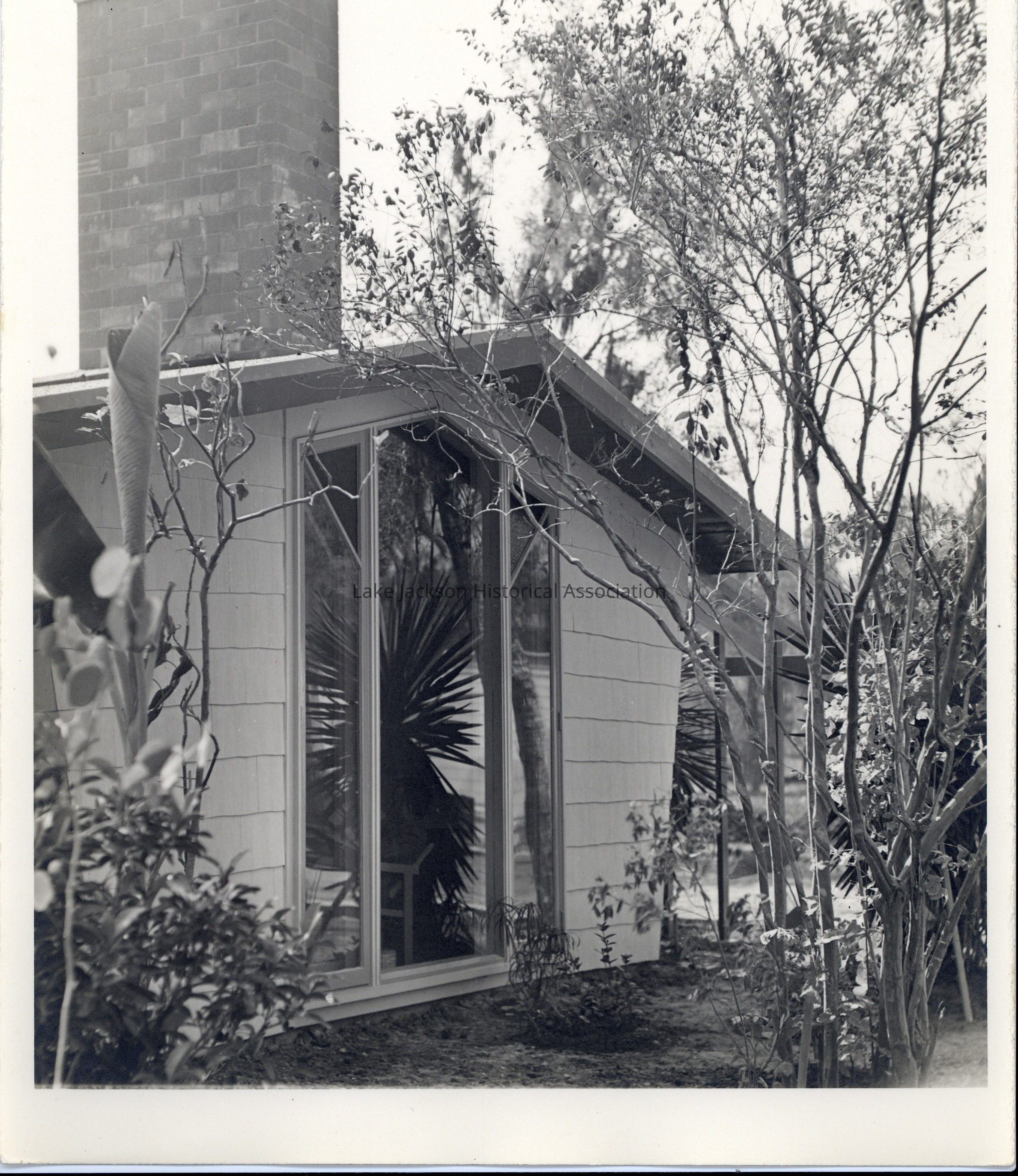 Black and white photo of exterior view of Alden Dow's office showing the window that was the inspiration for the museum logo.Collection