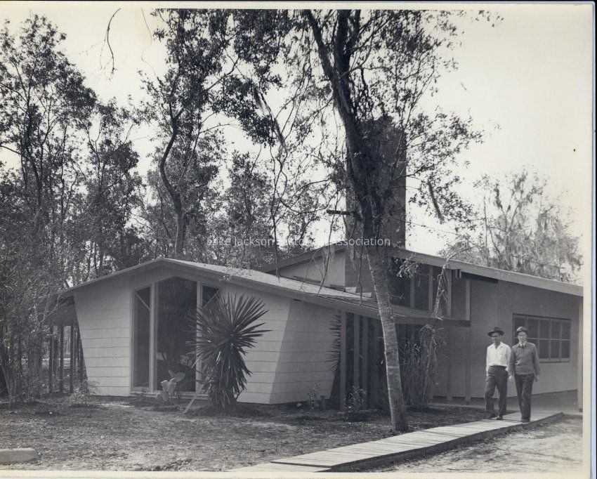 Black and white photo of exterior view of Alden Dow's office showing two men walking past.Collection