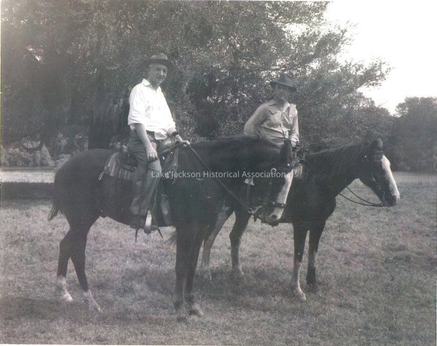 Black and white photo of brothers Williard and Alden Dow sitting on their horses while in Lake Jackson. CopyCollection