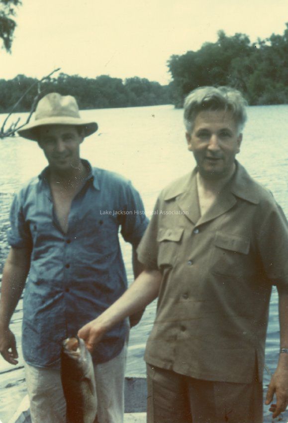Color photo of Willard Dow and unknown man fishing. Willard has a fish in his hand.Collection