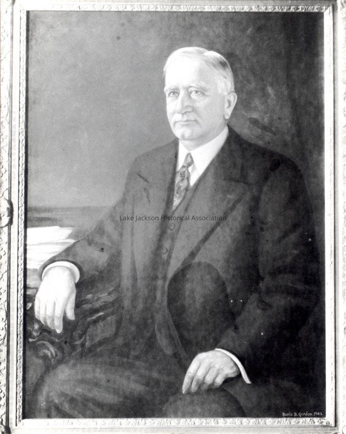 Black and white photo of a portrait-painting of Herber Henry Dow sitting next to a table with his arm rested on it.Collection