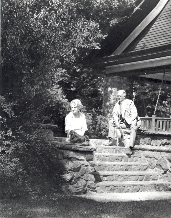 (COPY)Black and white photo of Herbert Henry Dow and his wife Grace Dow sitting on steps, maybe at their home. Grace has a small dog sitting beside her.Collection