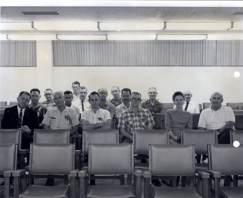 The back of the photograph has a paper label (7.75 x 10.0 inches) attached to it. The paper has the photograph title (see above) and identifies the employees in the photograph. Front Row: L.H. Packard, A.Z. Walker, R.L. Lookingbill, Jr., W.H. Caines, Olive Roberts, W.H. Callaway. Second Row: H.C. Rodgers, W.E. Williams, J.L. Lucas, J.W. Stephens. Third Row: W.C. Crocker, J.C. Myers, K.R. Evans, D.S. Kahler, L.F. Warsing. Fourth Row: J.W. Brown.