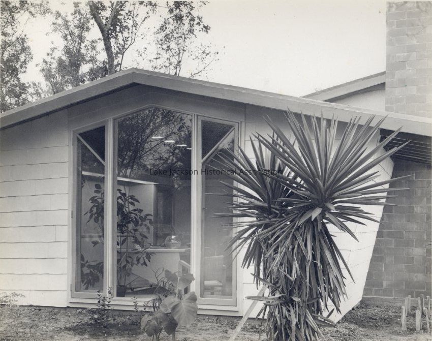 Black and white close up photo of exterior view of Alden Dow's office, through the windo one can see Alden's desk, chairs, and even a bowl that rests on his desk top.Collection