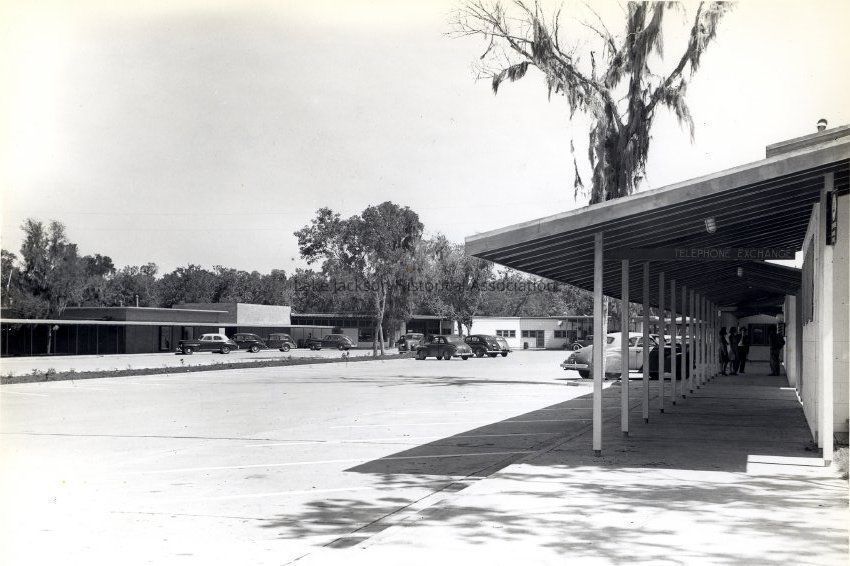Black and white photo of exterior Alden Dow office building, one can see down the covered walk way. There is a sign above in the covered walk way that reads "Telephone Exchange."Collection