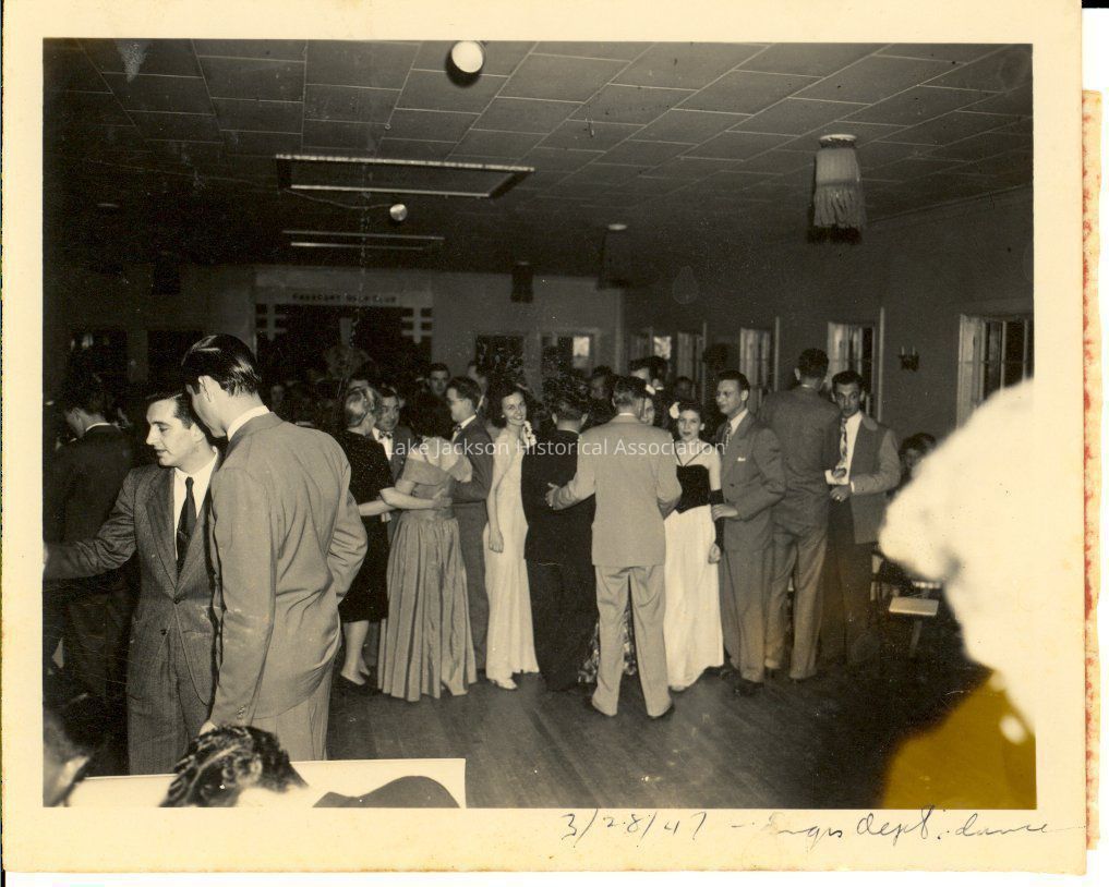 Black and White photo of couples mingling at Dows Engineering Department Dance on March 28, 1947.Collection