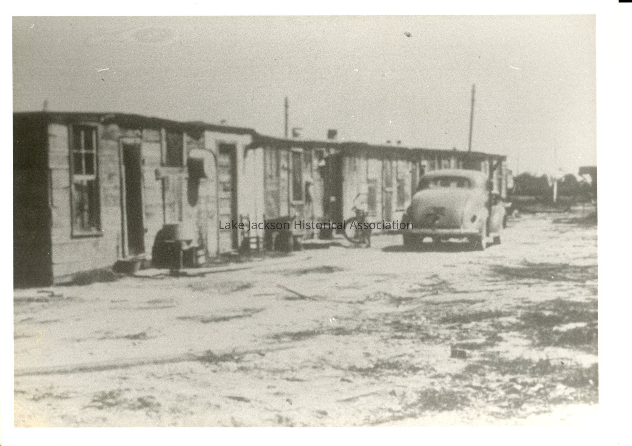 Black and White photo of the unpaved roads and shacks that existed in Camp Chemical. A bike is seen infront of one of the shacks and a car is driving down the road.Collection
