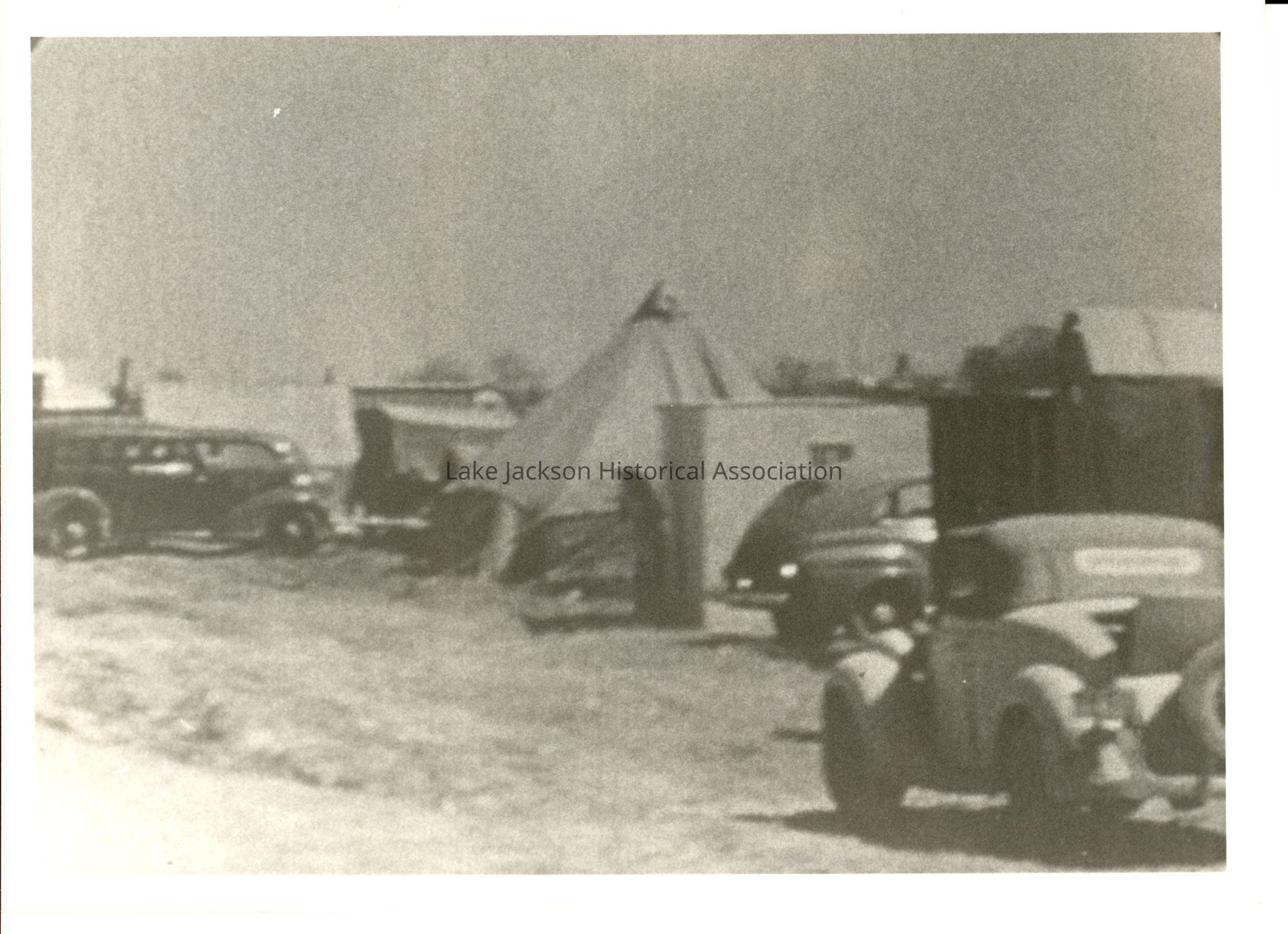 Black and White photo of the unpaved roads, shacks, and tents that existed in Camp Chemical. Cars are parked next to the shacks and another is driving down the road.Collection