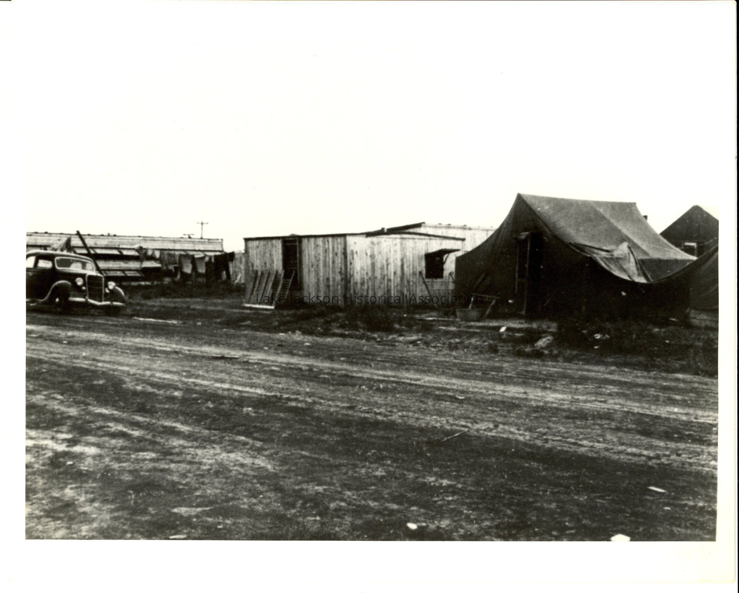Black and White photo of the unpaved roads, shacks, and tents in Camp Chemical