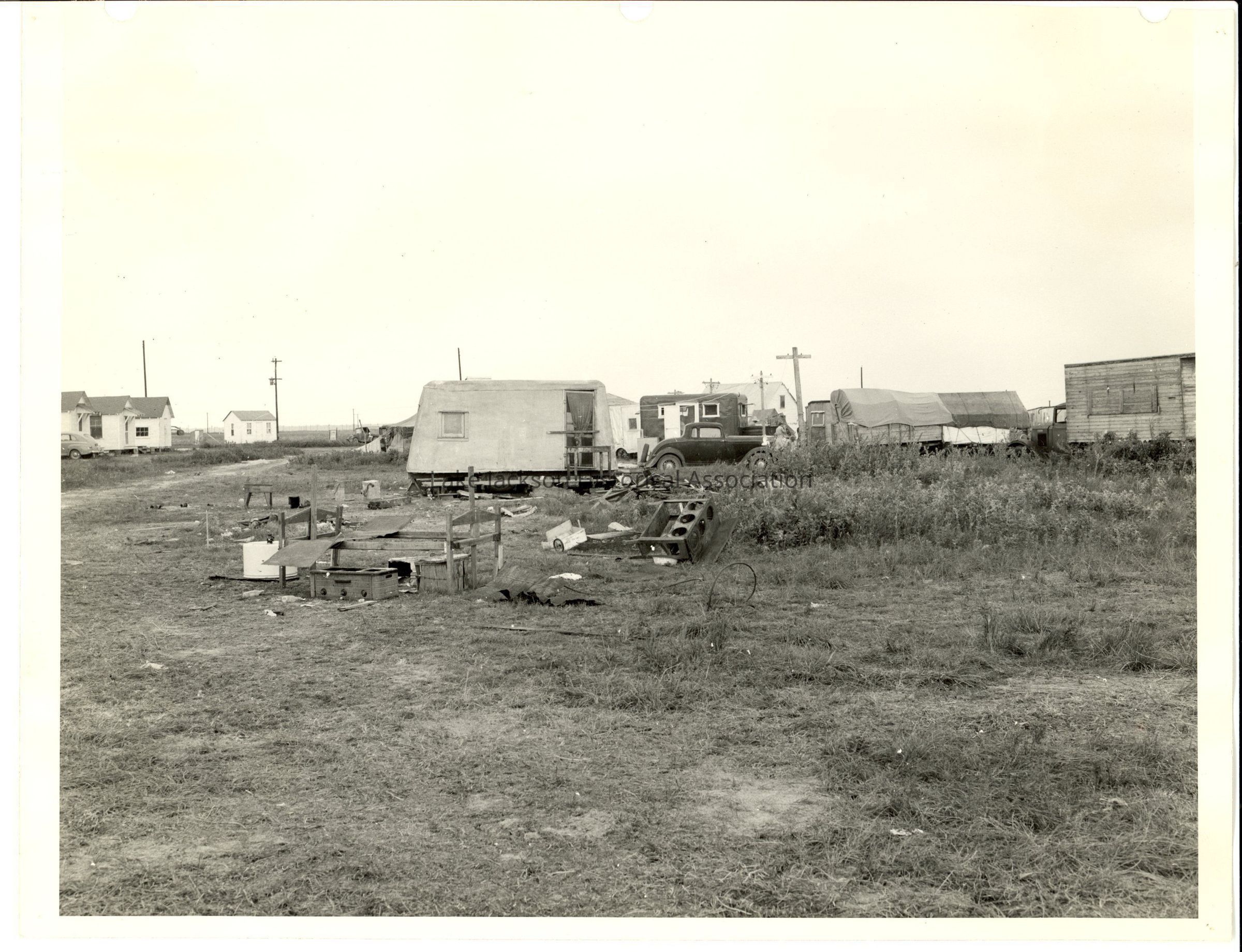 Black and White photo of debris, trails and shacks in Camp Chemical.