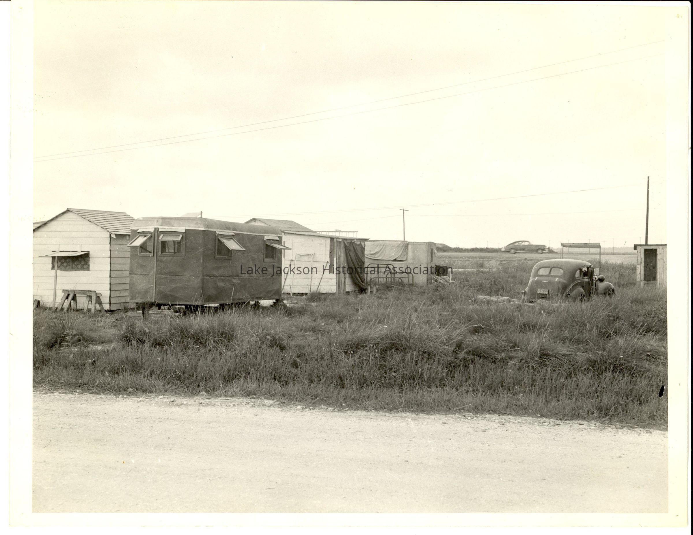 Black and White photo ofthe shacks and trailers that made up Camp Chemical. The land they are on are overgrown with grass and weeds.Collection