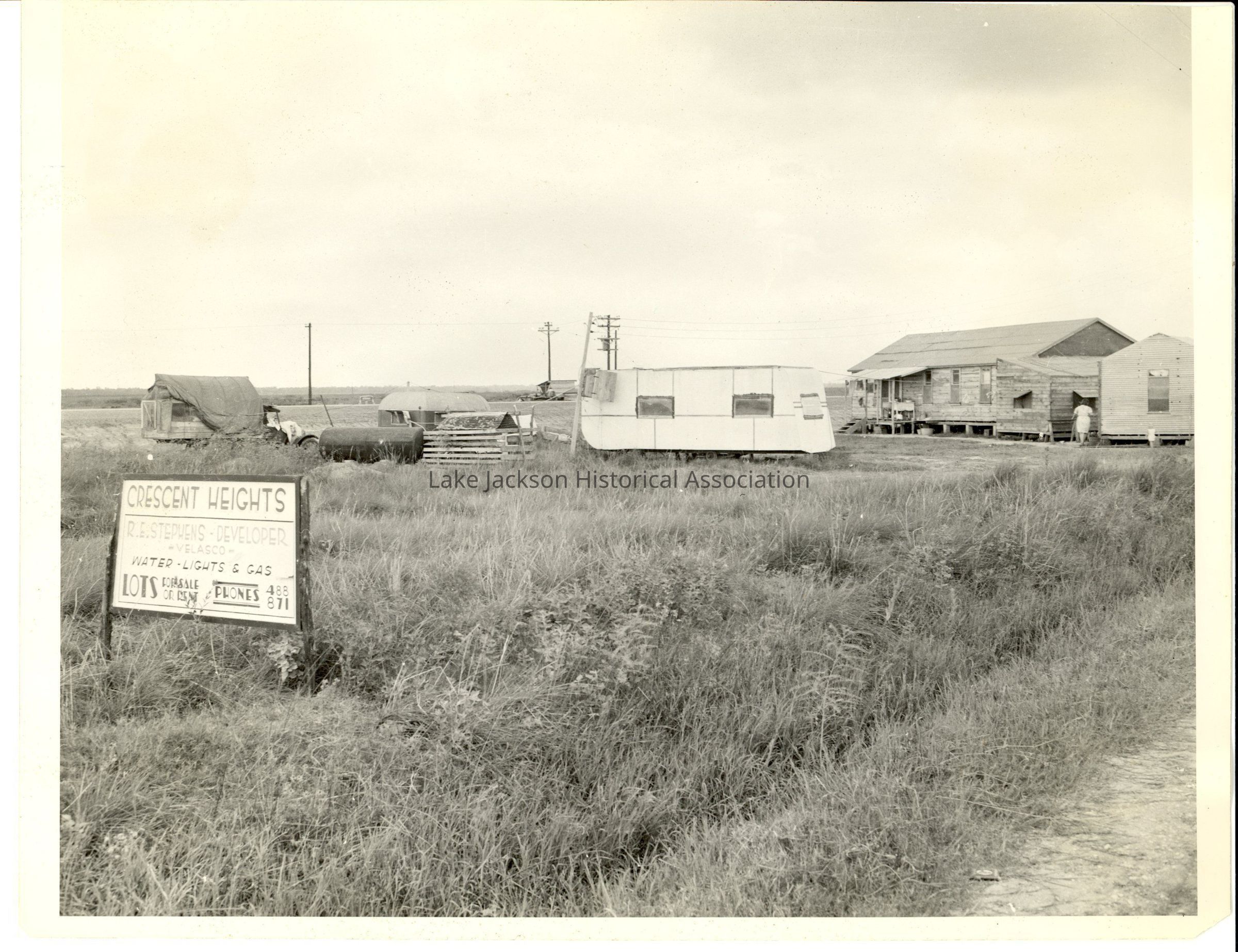 Black and White photo of trailers and houses on land that has a sign that reads: Crescent Heights: R.E. Stephens -Developer Velasco. Water-Lights and Gas Lots for Sale or Rent Phones 488 and 871Collection