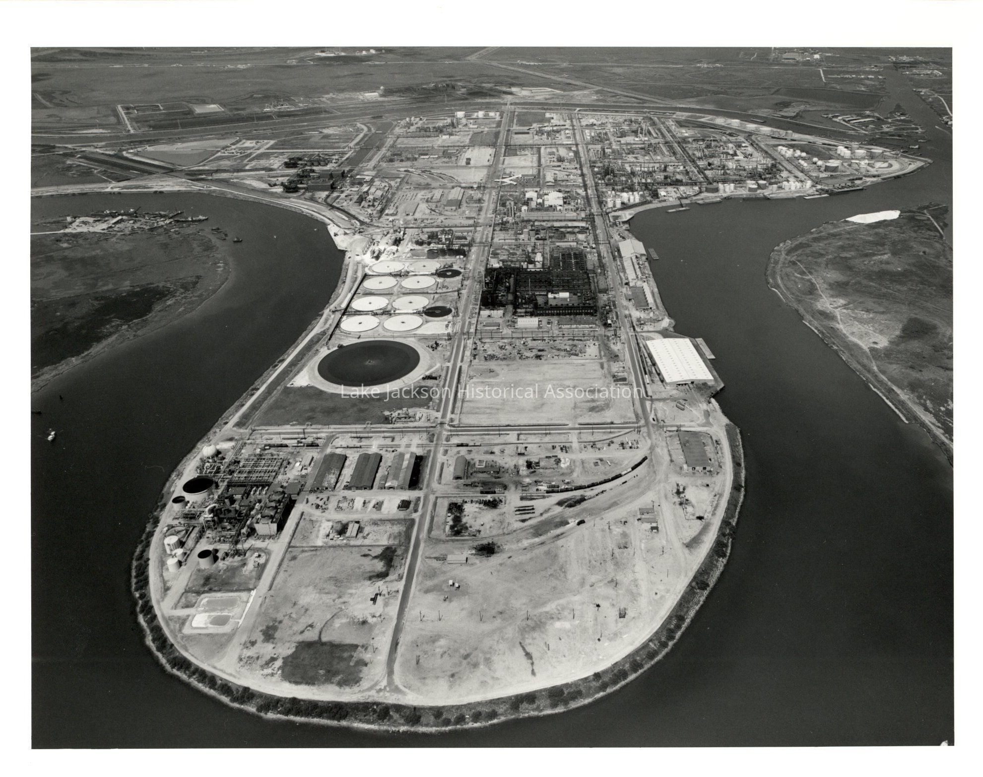 Black and White photo of the aerial view of Plant A. Taken fron the front of the peninsula point of the plant. Taken in 1970-71Collection