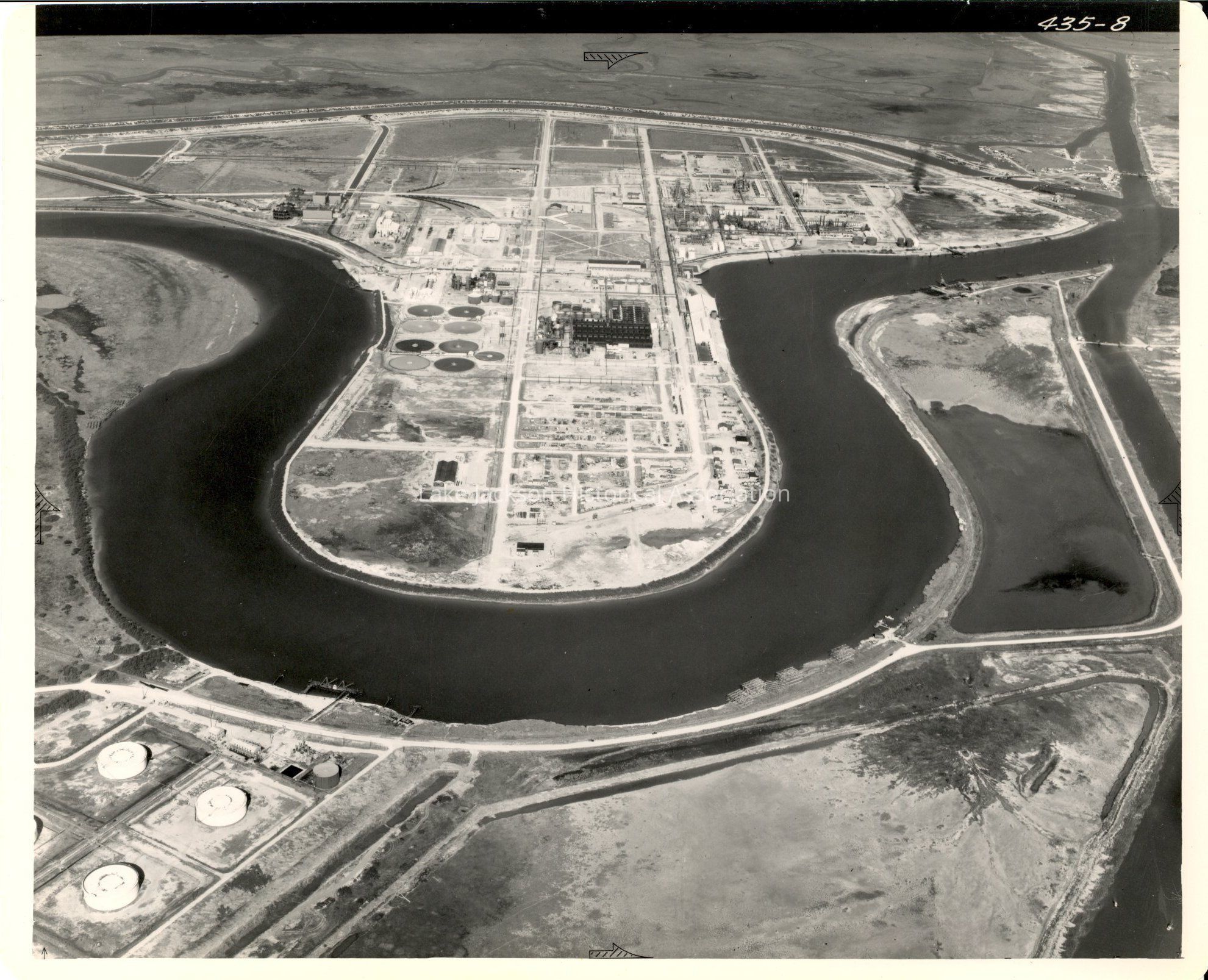 Black and White photo of the aerial view of Plant A. Taken fron the front of the peninsula point of the plant at a further distance. Taken in 1949Collection