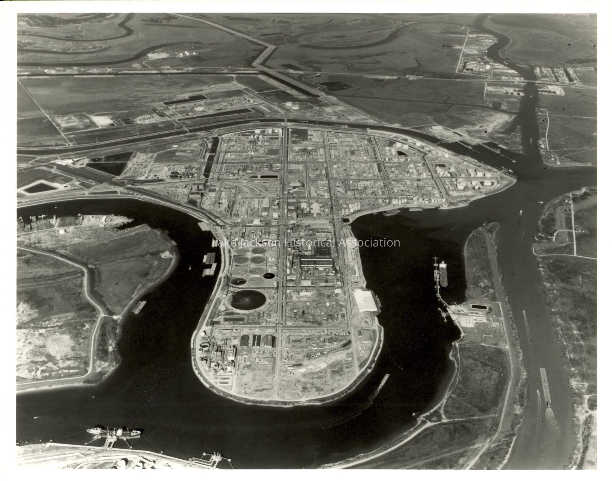 Black and White photo of the aerial view of Plant A. Taken fron the front of the peninsula point of the plant.Collection