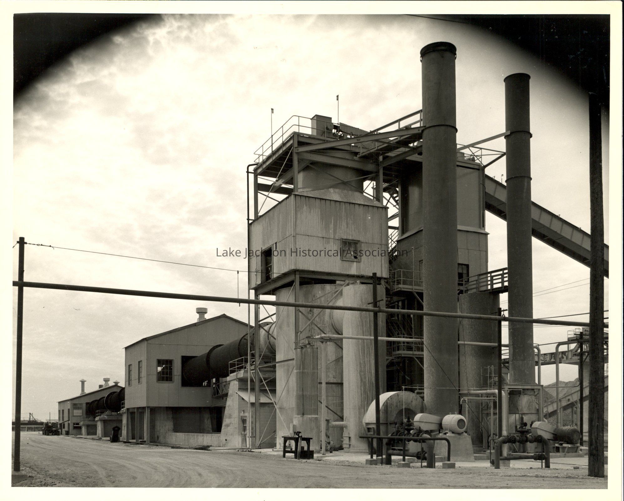 Black and White photo of the Lime Kiln at Plant A. Two large black tubes are seen going into a building, This photo was taken at a further distance. Taken in early 1970s.Collection