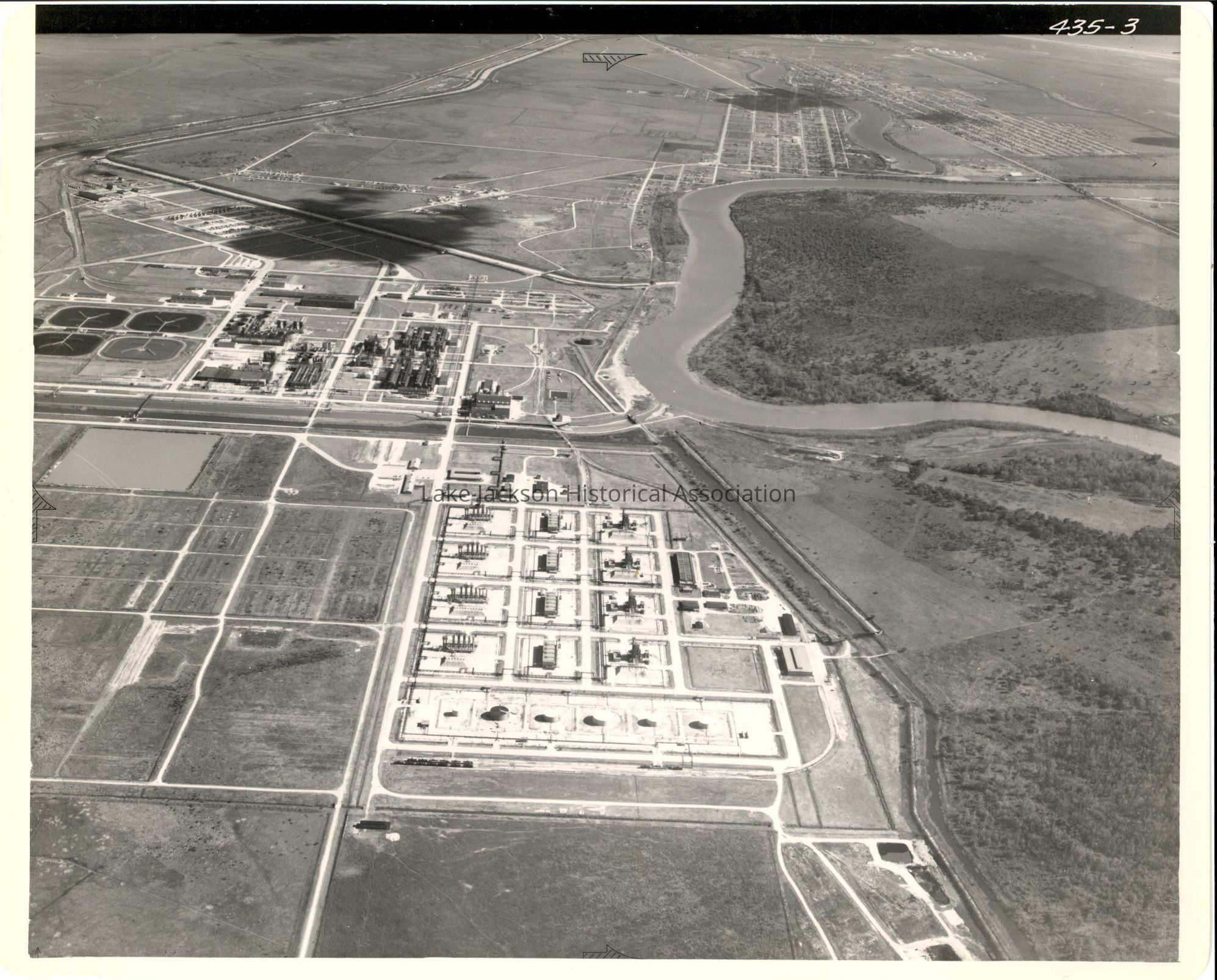 Black and white aerial photo of Dow Chemical Plant B, river is seen on the right side of the plant. Taken on November 19, 1949Collection