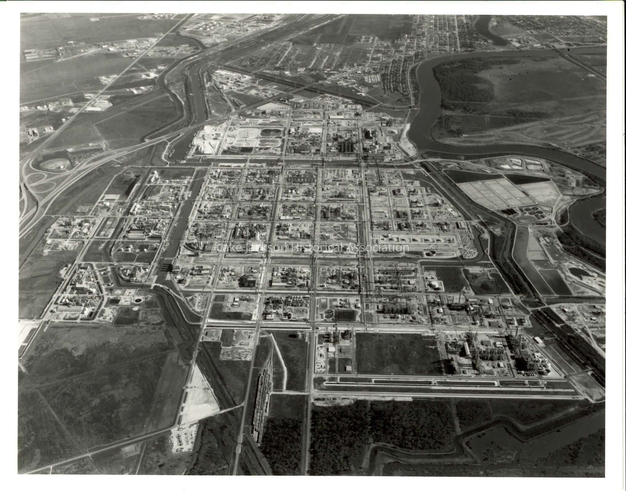 Black and white aerial photo of Dow Chemical Plant B taken at a distance. Various buildings, roads, and rivers can be seen.Collection