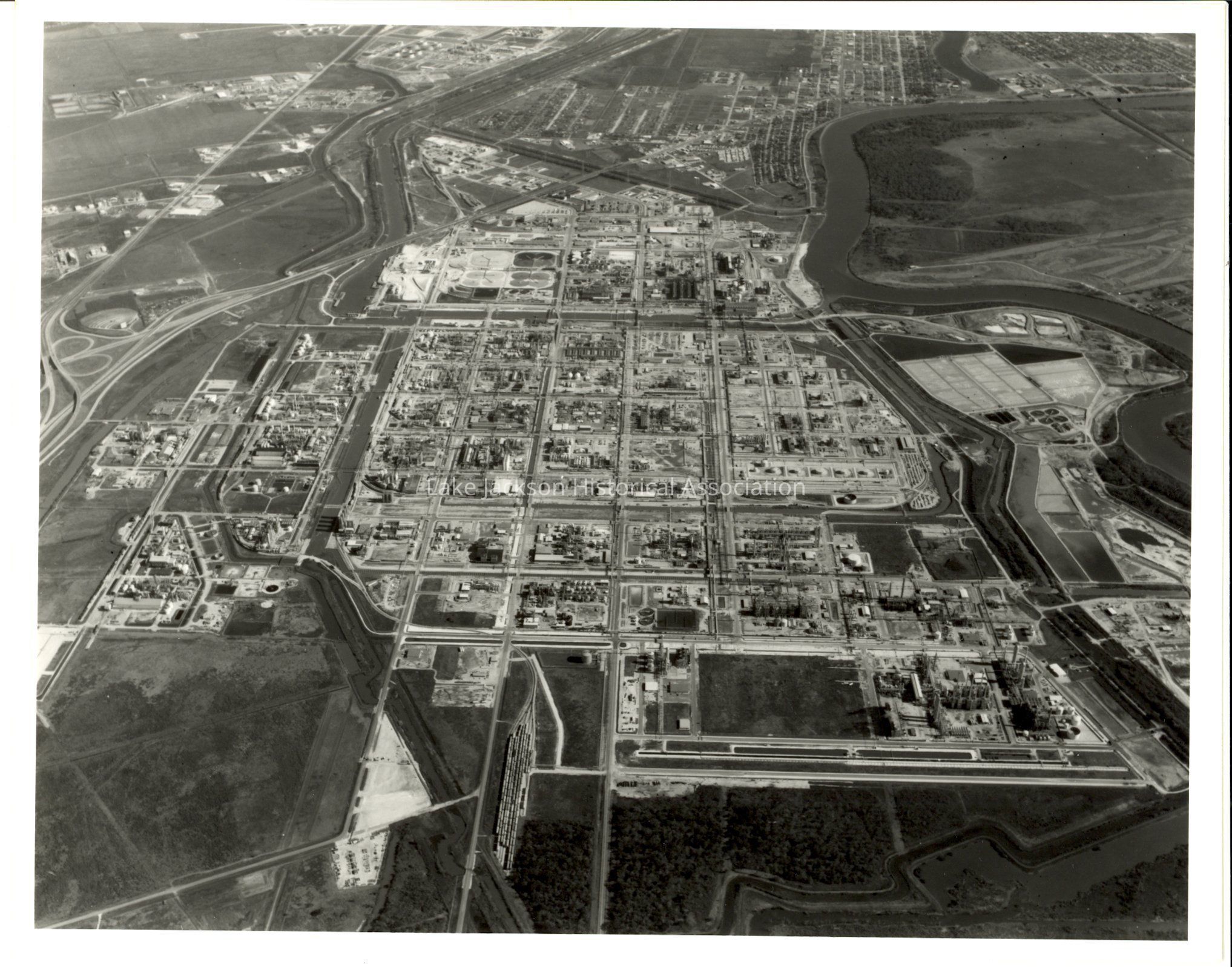 Black and white aerial photo of Dow Chemical Plant B taken at a distance. Various buildings, roads, and rivers can be seen.Collection
