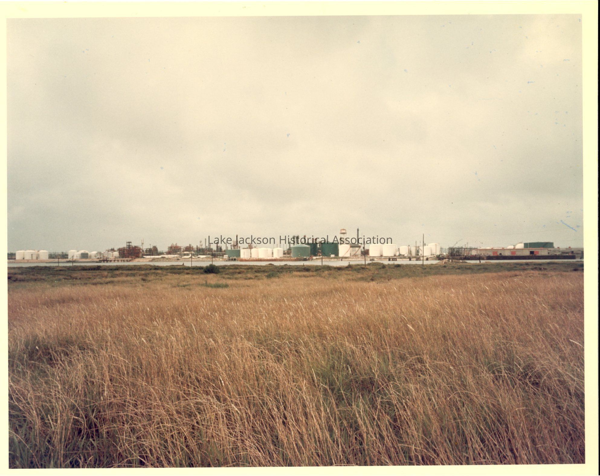 Color photo of Dow Chemical Plant B taken at a distance from a field of grass, it seems the plant is on the other side of the river. Various buildings and tanks can be seen. Taken in 1975Collection