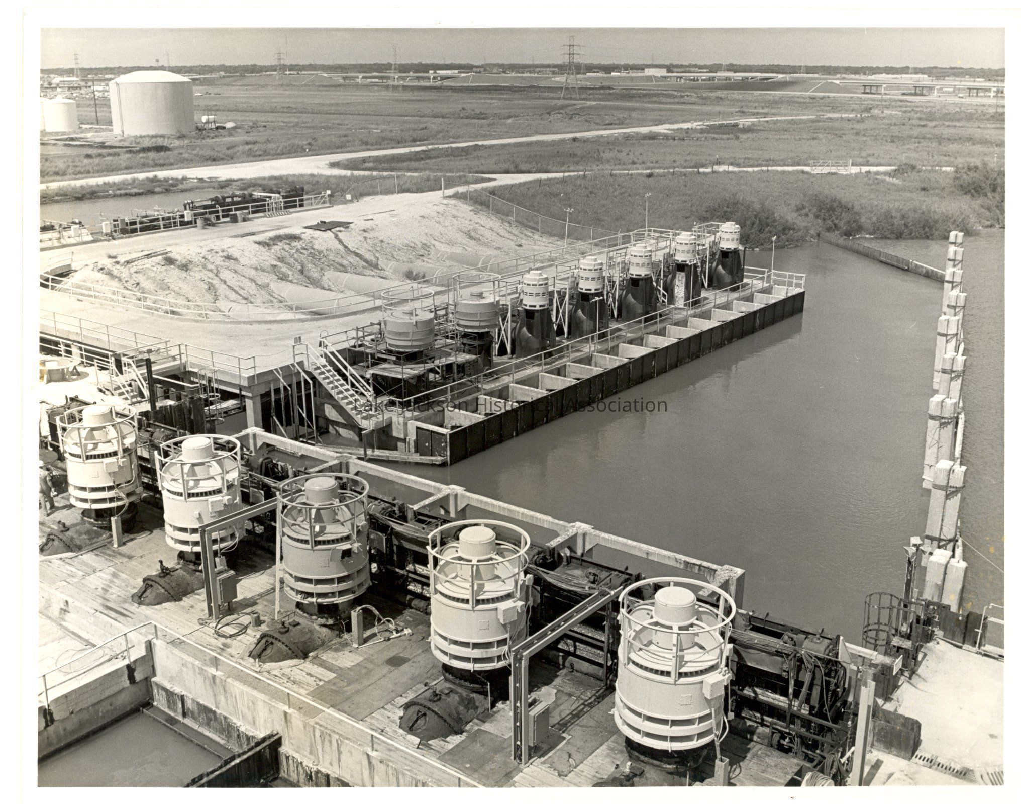 Black and white close-up aerial photo of the Seawater Intake at Dow Chemical Plant B. Taken in the early 1950s.Collection