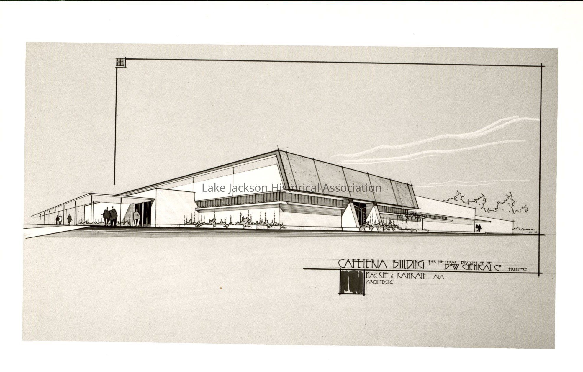 Black and white photo of the architectural drawing of the Cafeteria building at Dow Chemical in Freeport. Drawing was done by MacKie and Kamrath Architects.Collection