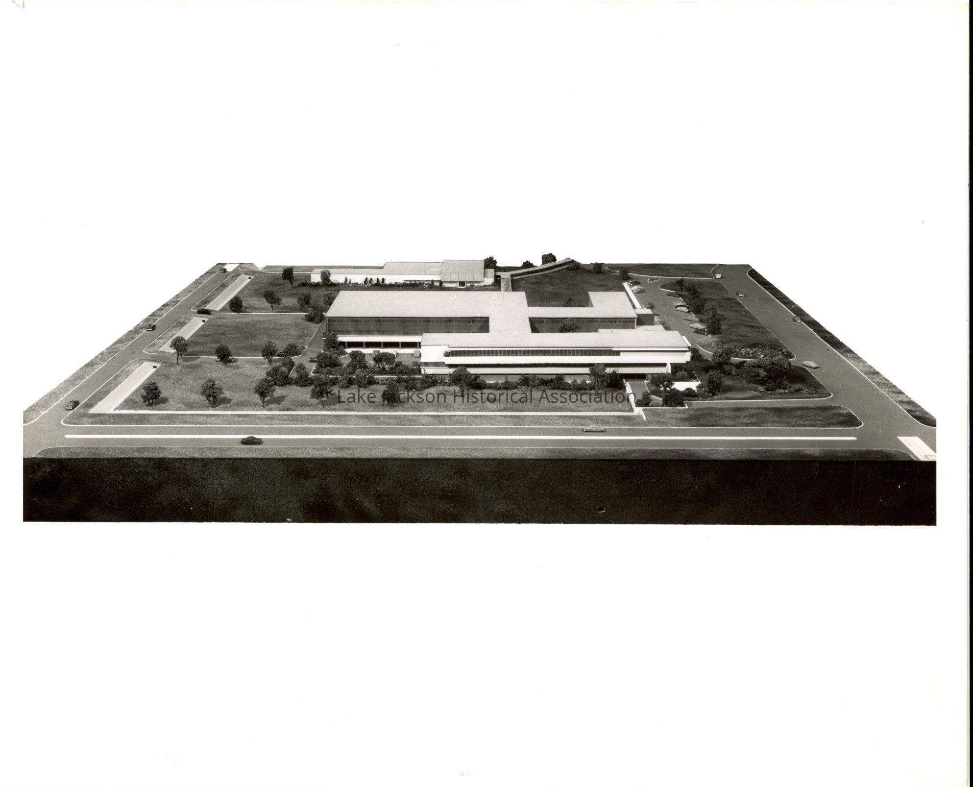 Black and white side view photo of a model of the A.P. Beutel Building that is located at Dow Chemical. Taken on February 3, 1956.Collection