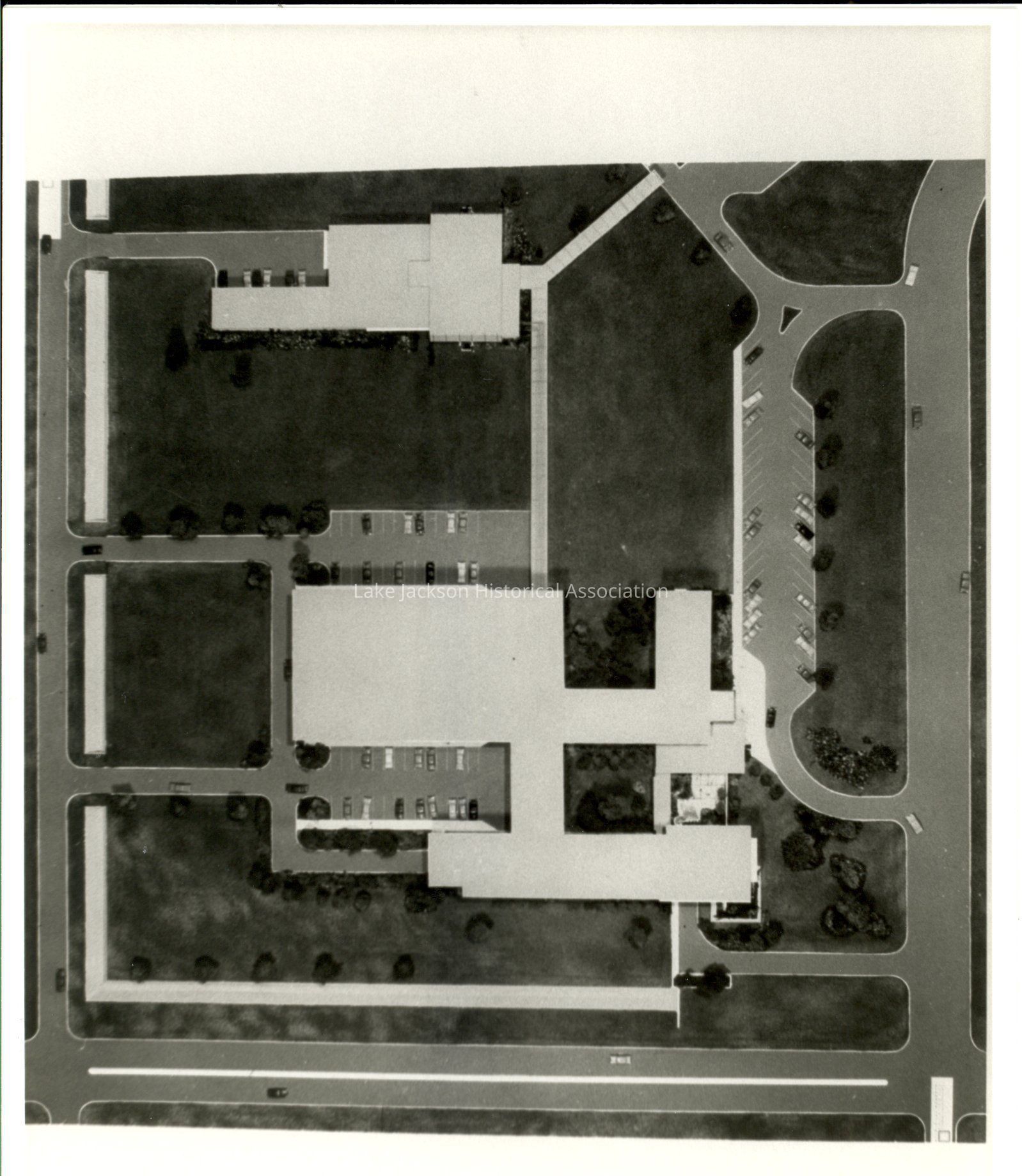 Black and white birdseye view photo of a model of the A.P. Beutel Building that is located at Dow Chemical. Taken on March 3, 1956.Collection
