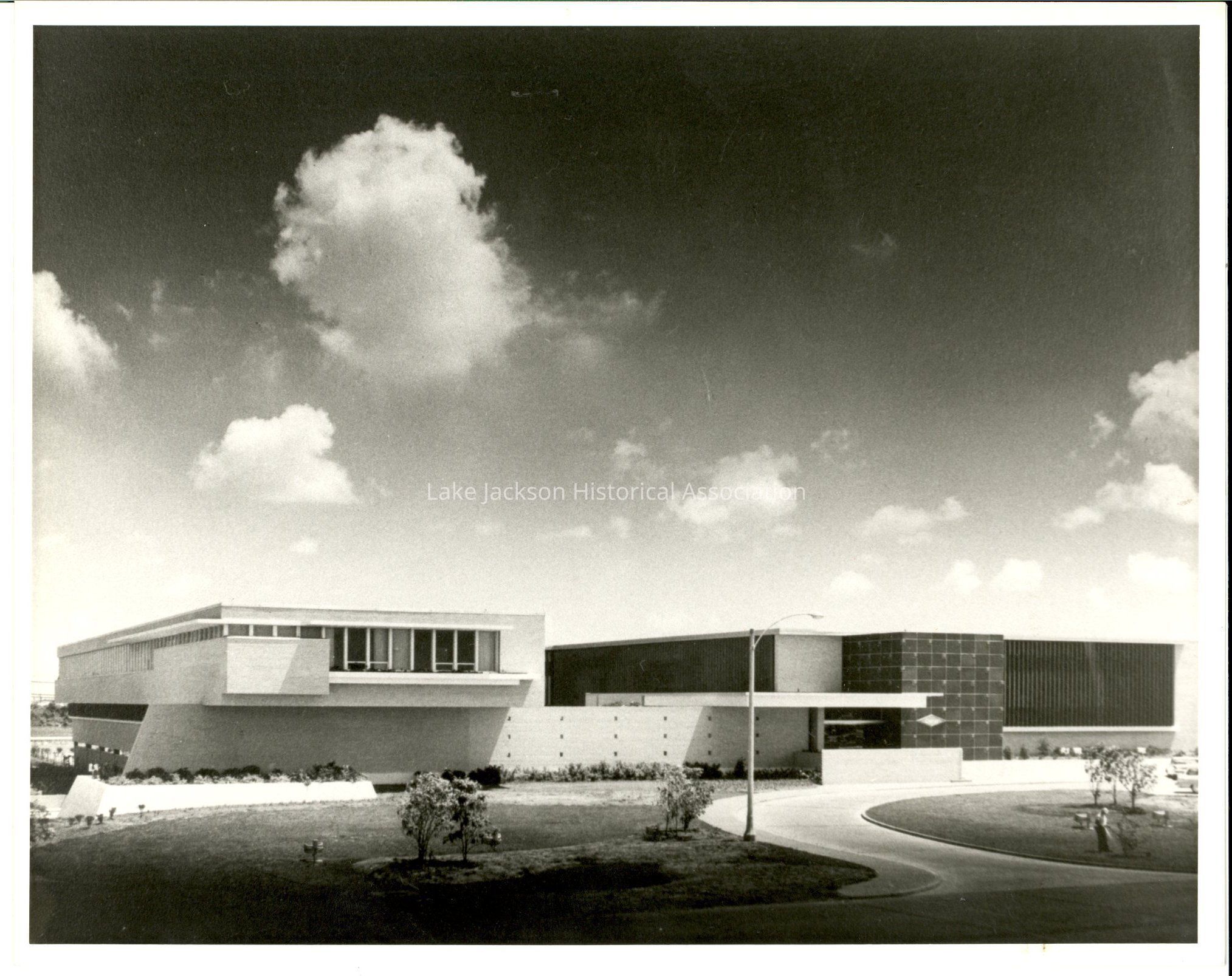 Black and white (left angle view) photo of the front of the A.P. Beutel building located at Dow, the photo was taken from an elevated location.Collection