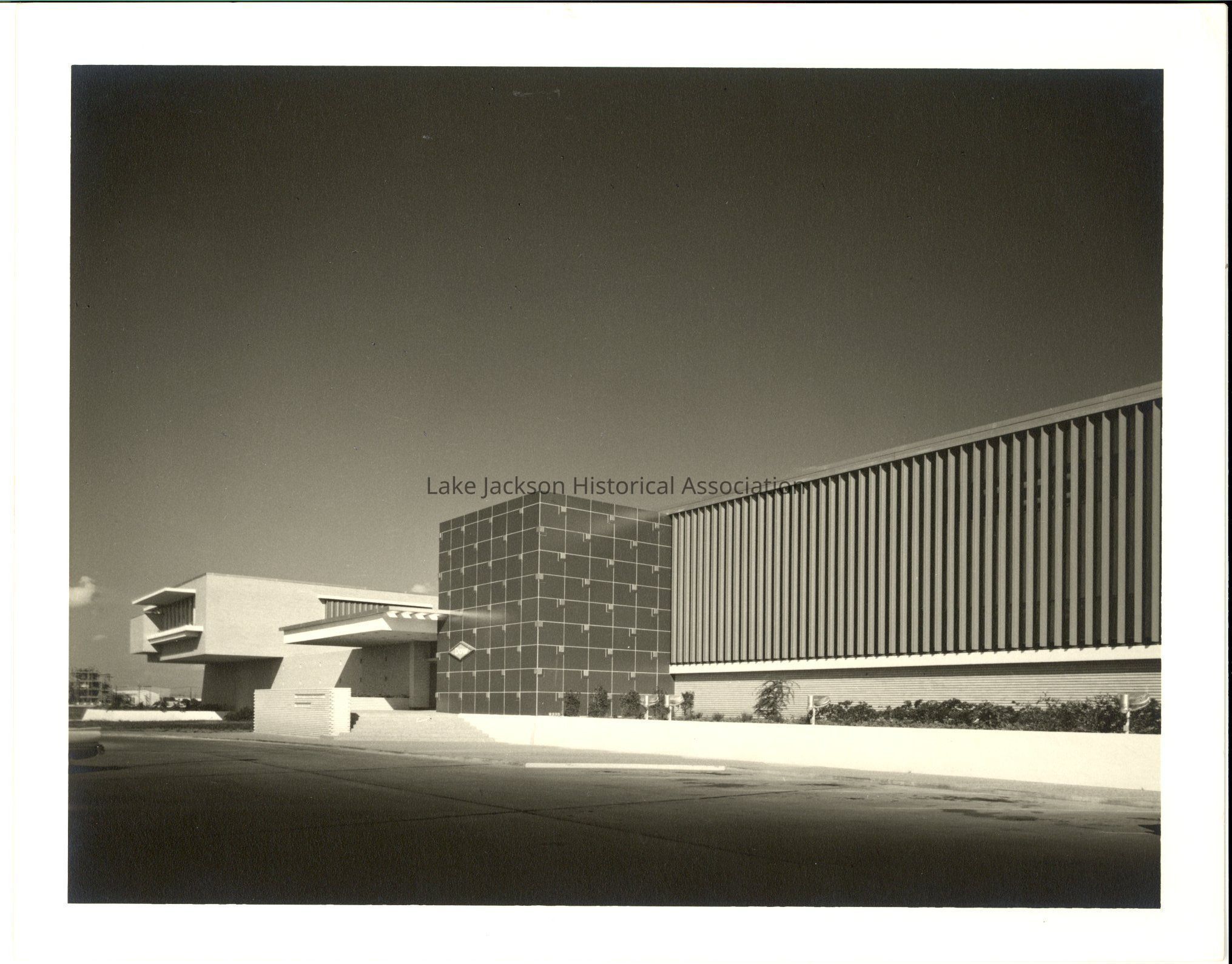 Black and white (right angle close-up) photo of the front of the A.P. Beutel building located at Dow. Taken soon after constructions in the 1950s.Collection