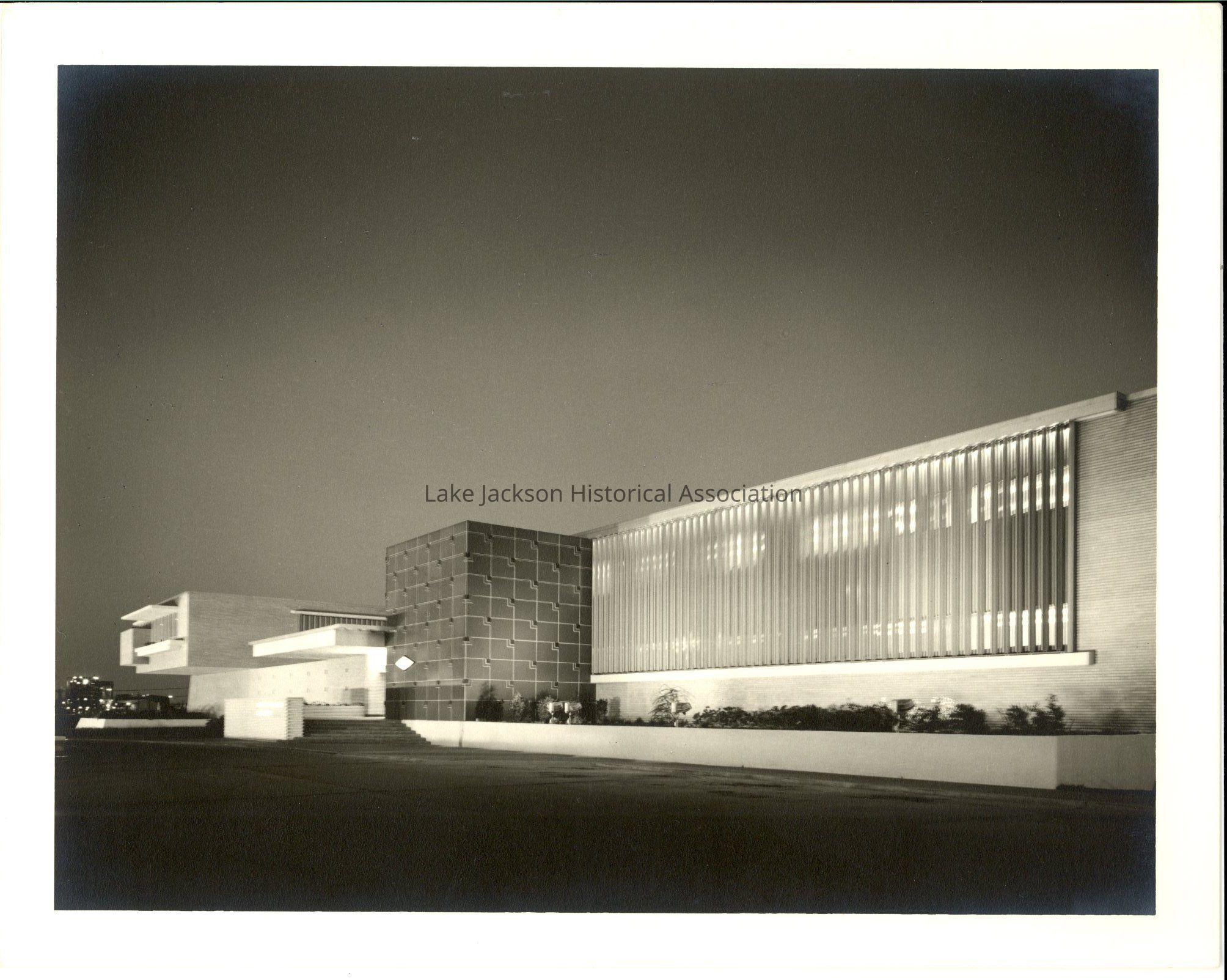 Black and white (right angle close-up) photo of the front of the A.P. Beutel building at night with the lights on. Taken soon after constructions in the 1950s.Collection