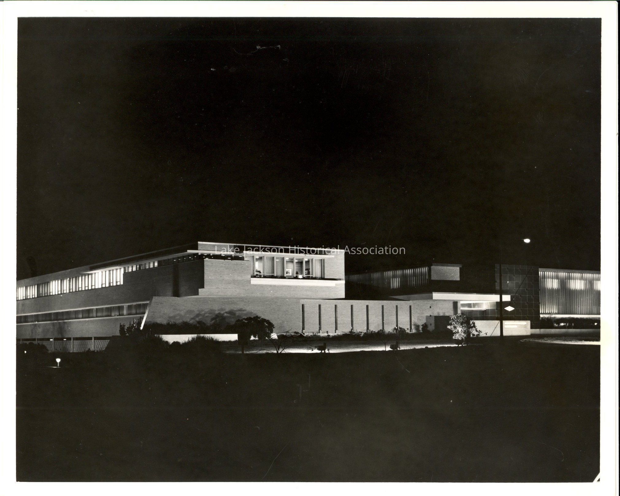 Black and white (left angle) photo of the front of the A.P. Beutel building at night with the lights on. Taken soon after constructions in the 1950s.Collection