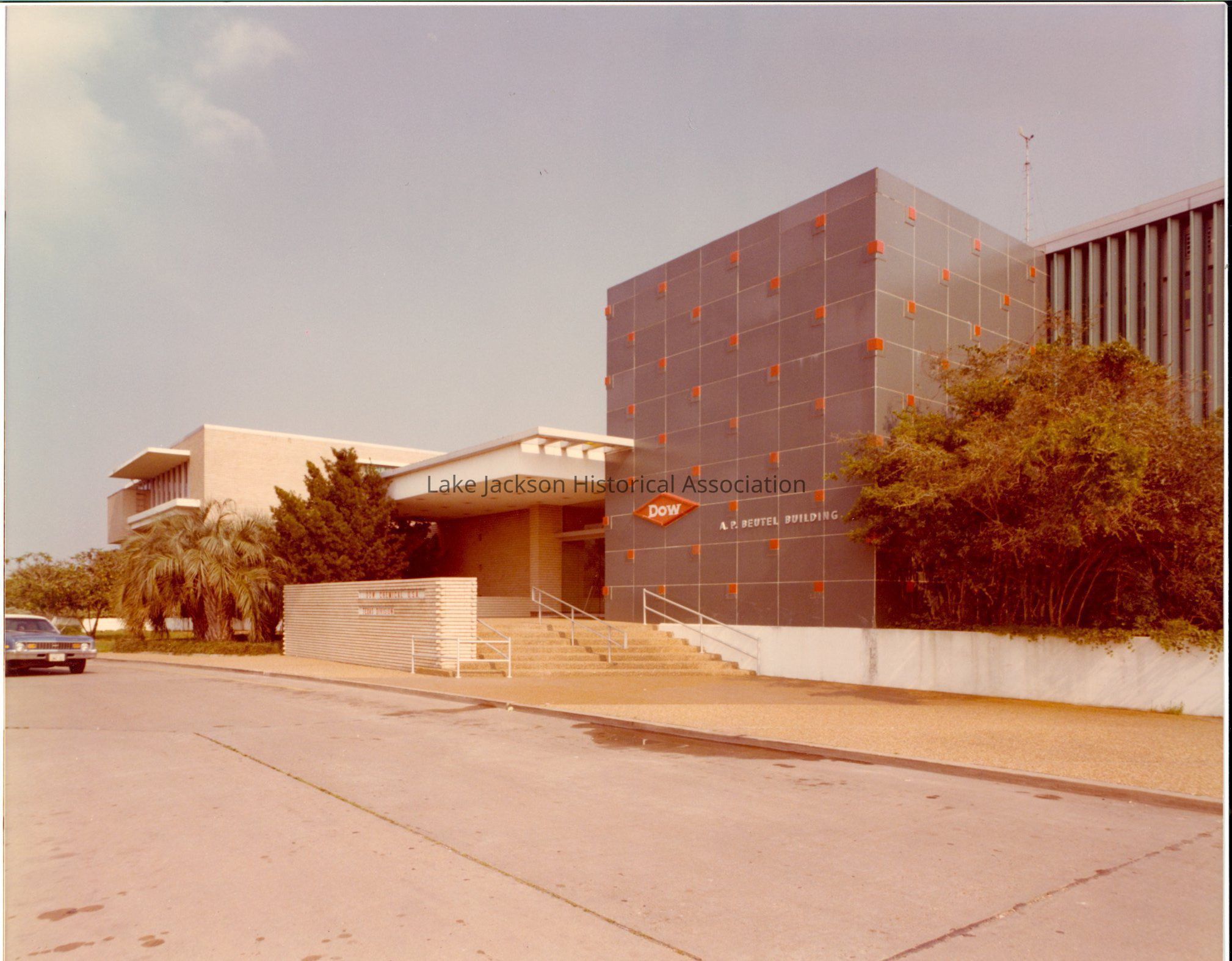 Color (right angle) photo of the front of the A.P. Beutel building at the Dow Chemical Plant, a car is driving past the building. Taken in 1977.Collection