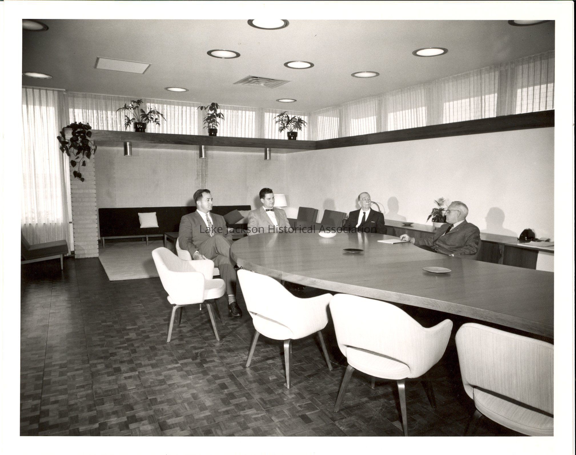 Black and white photo of a conference room in the A.P. Beutel Building at the Dow Chemical Plant, seated at the table is A.P. Beutel on the right with three other gentlemen. Taken on October 25, 1957.Collection