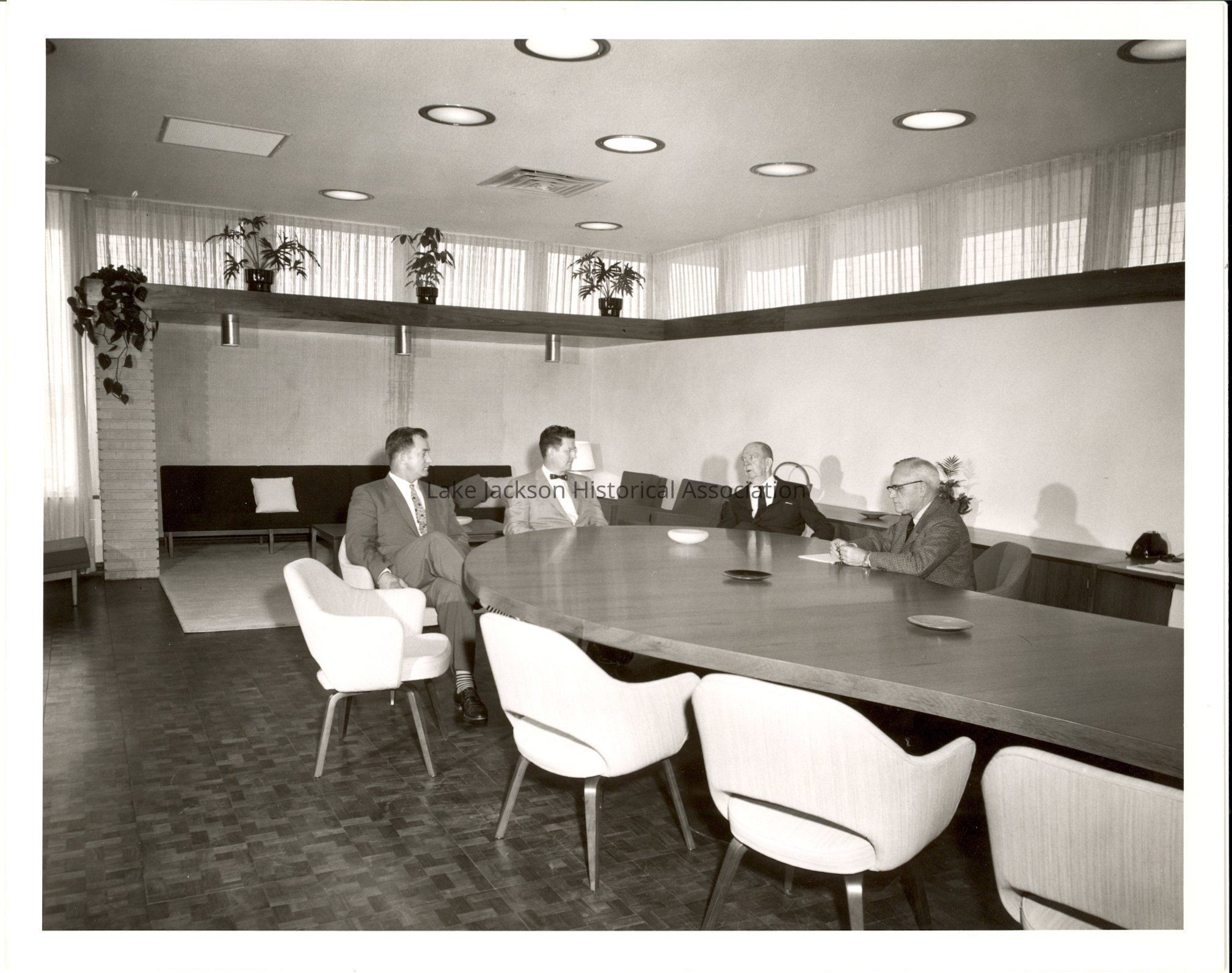 Black and white photo of a conference room in the A.P. Beutel Building at the Dow Chemical Plant, seated at the table is A.P. Beutel on the right with three other gentlemen. They seem to be in conversation. Taken on October 25, 1957.Collection