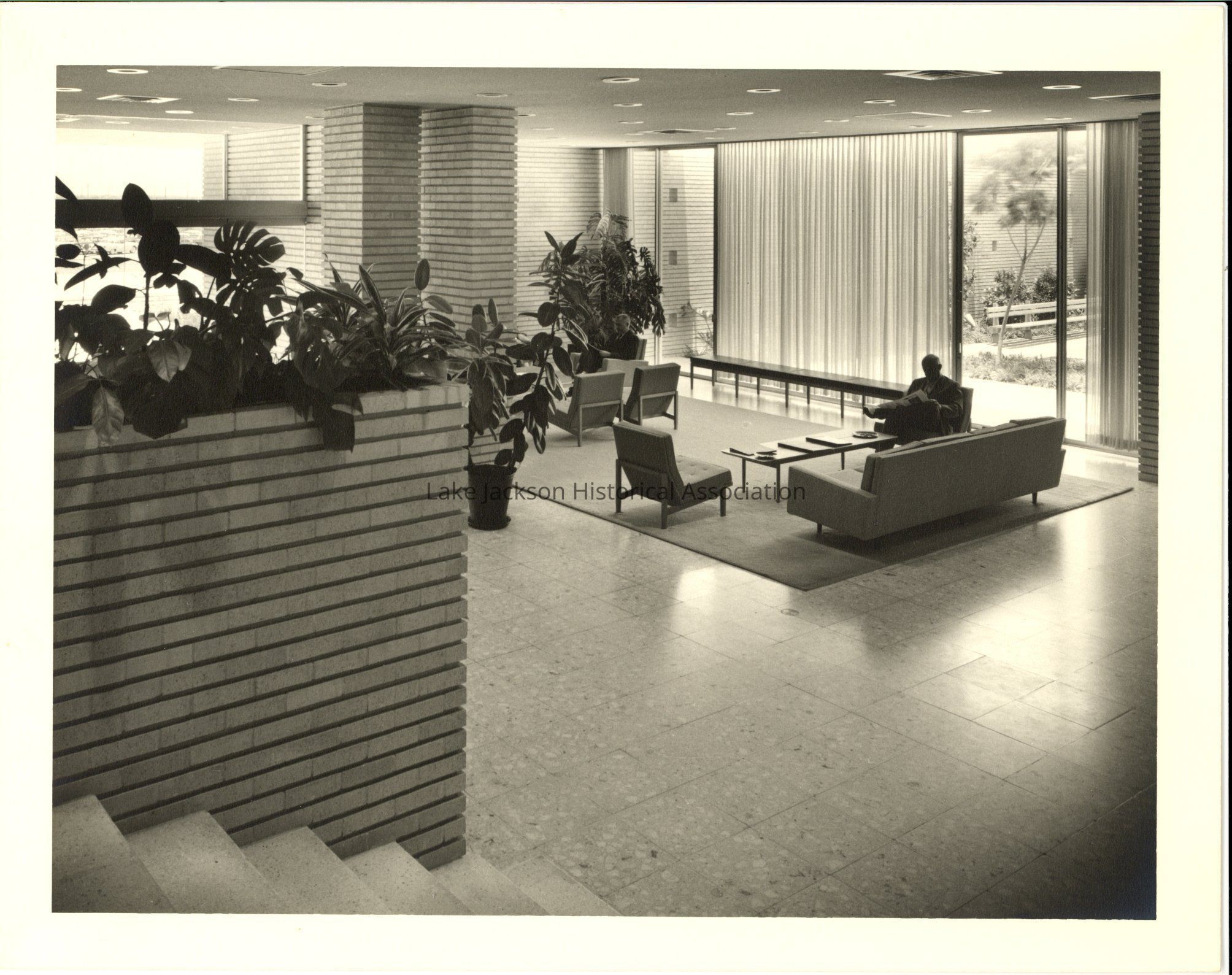 Black and white close-up photo of a lounge area in the A.P. Beutel Building at the Dow Chemical Plant, a man is seated in the loungereading a paper or magazine.Collection